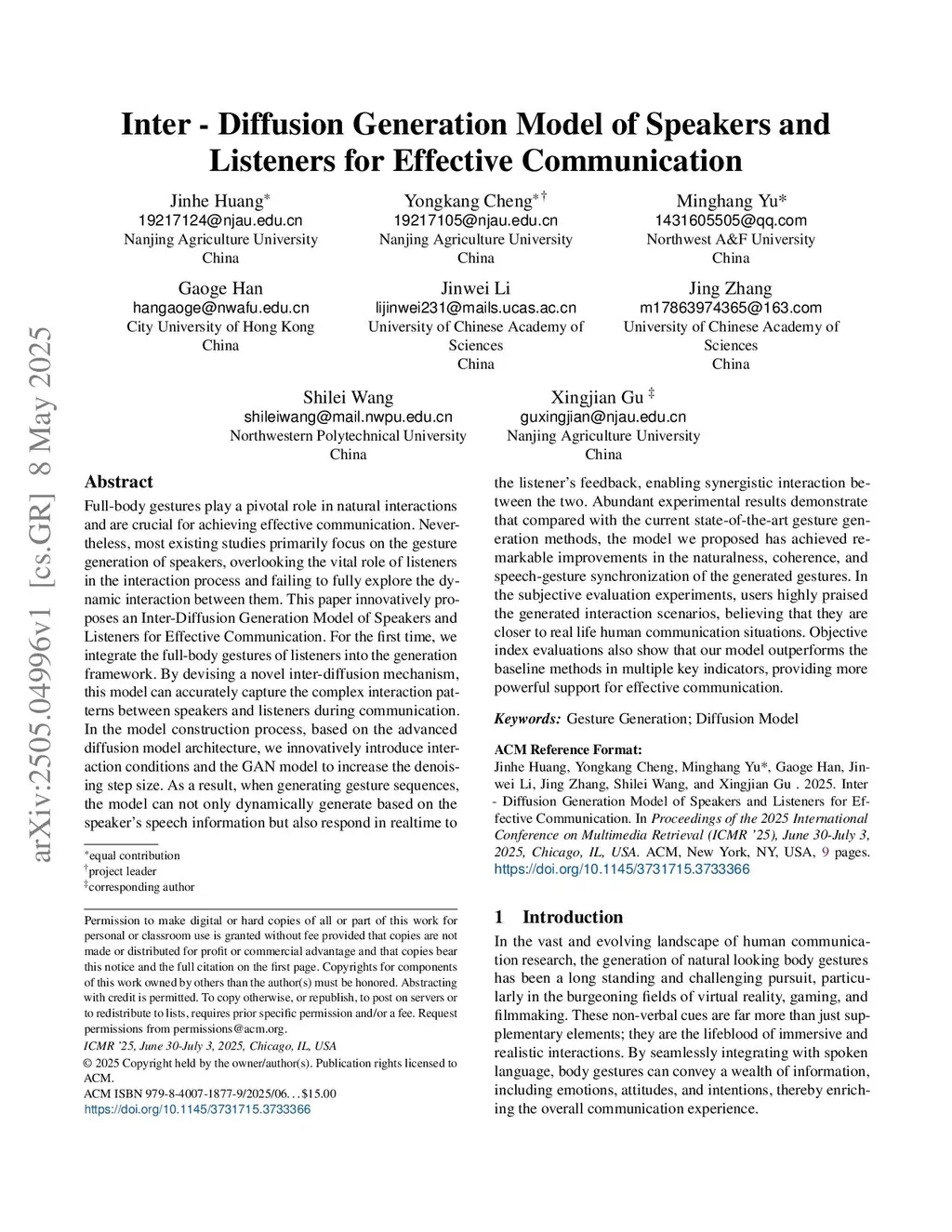 Full-body gestures play a pivotal role in natural interactions and are crucial for achieving effective communication. Nevertheless, most existing studies primarily focus on the gesture generation of speakers, overlooking the vital role of listeners in the interaction process and failing to fully explore the dynamic interaction between them. This paper innovatively proposes an Inter-Diffusion Generation Model of Speakers and Listeners for Effective Communication. For the first time, we integrate the full-body gestures of listeners into the generation framework. By devising a novel inter-diffusion mechanism, this model can accurately capture the complex interaction patterns between speakers and listeners during communication. In the model construction process, based on the advanced diffusion model architecture, we innovatively introduce interaction conditions and the GAN model to increase the denoising step size. As a result, when generating gesture sequences, the model can not only dynamically generate based on the speaker's speech information but also respond in realtime to the listener's feedback, enabling synergistic interaction between the two. Abundant experimental results demonstrate that compared with the current state-of-the-art gesture generation methods, the model we proposed has achieved remarkable improvements in the naturalness, coherence, and speech-gesture synchronization of the generated gestures. In the subjective evaluation experiments, users highly praised the generated interaction scenarios, believing that they are closer to real life human communication situations. Objective index evaluations also show that our model outperforms the baseline methods in multiple key indicators, providing more powerful support for effective communication.