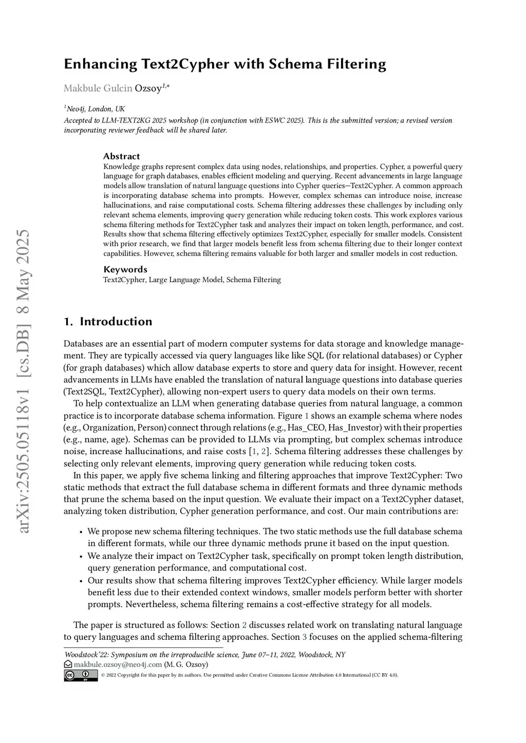 Knowledge graphs represent complex data using nodes, relationships, and properties. Cypher, a powerful query language for graph databases, enables efficient modeling and querying. Recent advancements in large language models allow translation of natural language questions into Cypher queries - Text2Cypher. A common approach is incorporating database schema into prompts. However, complex schemas can introduce noise, increase hallucinations, and raise computational costs. Schema filtering addresses these challenges by including only relevant schema elements, improving query generation while reducing token costs. This work explores various schema filtering methods for Text2Cypher task and analyzes their impact on token length, performance, and cost. Results show that schema filtering effectively optimizes Text2Cypher, especially for smaller models. Consistent with prior research, we find that larger models benefit less from schema filtering due to their longer context capabilities. However, schema filtering remains valuable for both larger and smaller models in cost reduction.