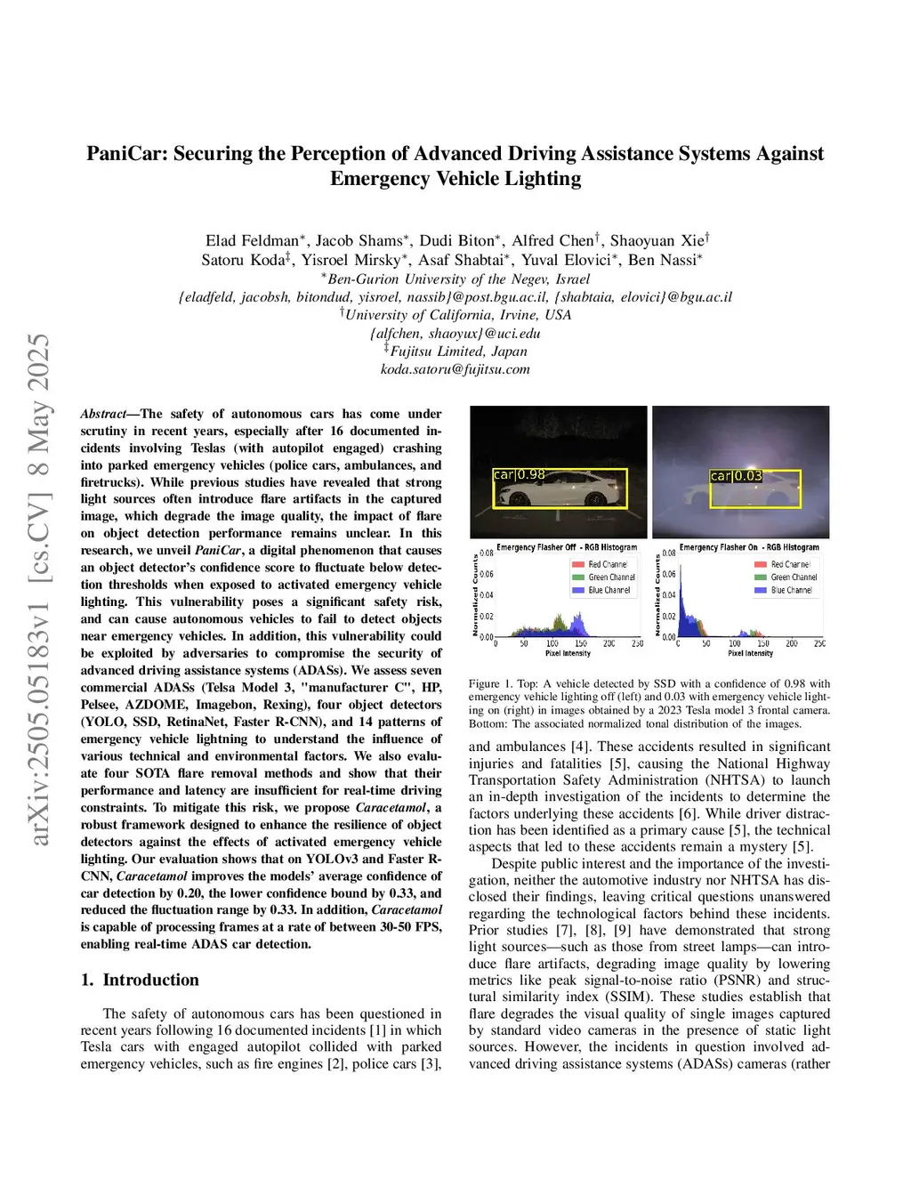 The safety of autonomous cars has come under scrutiny in recent years, especially after 16 documented incidents involving Teslas (with autopilot engaged) crashing into parked emergency vehicles (police cars, ambulances, and firetrucks). While previous studies have revealed that strong light sources often introduce flare artifacts in the captured image, which degrade the image quality, the impact of flare on object detection performance remains unclear. In this research, we unveil PaniCar, a digital phenomenon that causes an object detector's confidence score to fluctuate below detection thresholds when exposed to activated emergency vehicle lighting. This vulnerability poses a significant safety risk, and can cause autonomous vehicles to fail to detect objects near emergency vehicles. In addition, this vulnerability could be exploited by adversaries to compromise the security of advanced driving assistance systems (ADASs). We assess seven commercial ADASs (Tesla Model 3, "manufacturer C", HP, Pelsee, AZDOME, Imagebon, Rexing), four object detectors (YOLO, SSD, RetinaNet, Faster R-CNN), and 14 patterns of emergency vehicle lighting to understand the influence of various technical and environmental factors. We also evaluate four SOTA flare removal methods and show that their performance and latency are insufficient for real-time driving constraints. To mitigate this risk, we propose Caracetamol, a robust framework designed to enhance the resilience of object detectors against the effects of activated emergency vehicle lighting. Our evaluation shows that on YOLOv3 and Faster RCNN, Caracetamol improves the models' average confidence of car detection by 0.20, the lower confidence bound by 0.33, and reduces the fluctuation range by 0.33. In addition, Caracetamol is capable of processing frames at a rate of between 30-50 FPS, enabling real-time ADAS car detection.