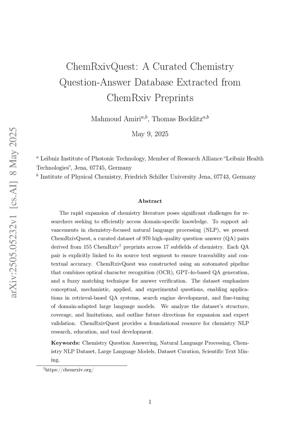 ChemRxivQuest: A Curated Chemistry Question-Answer Database Extracted from ChemRxiv Preprints