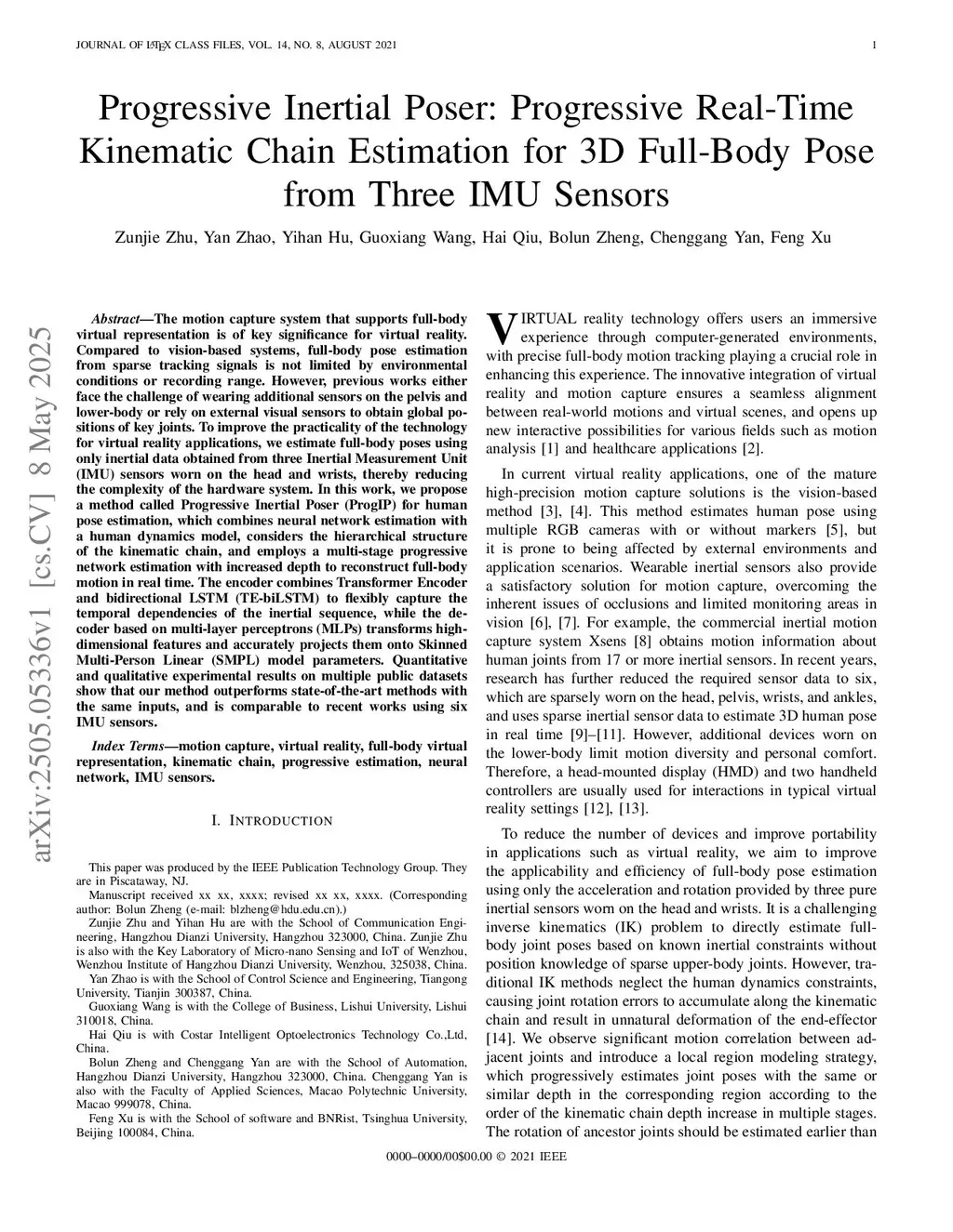 Progressive Inertial Poser: Progressive Real-Time Kinematic Chain Estimation for 3D Full-Body Pose from Three IMU Sensors