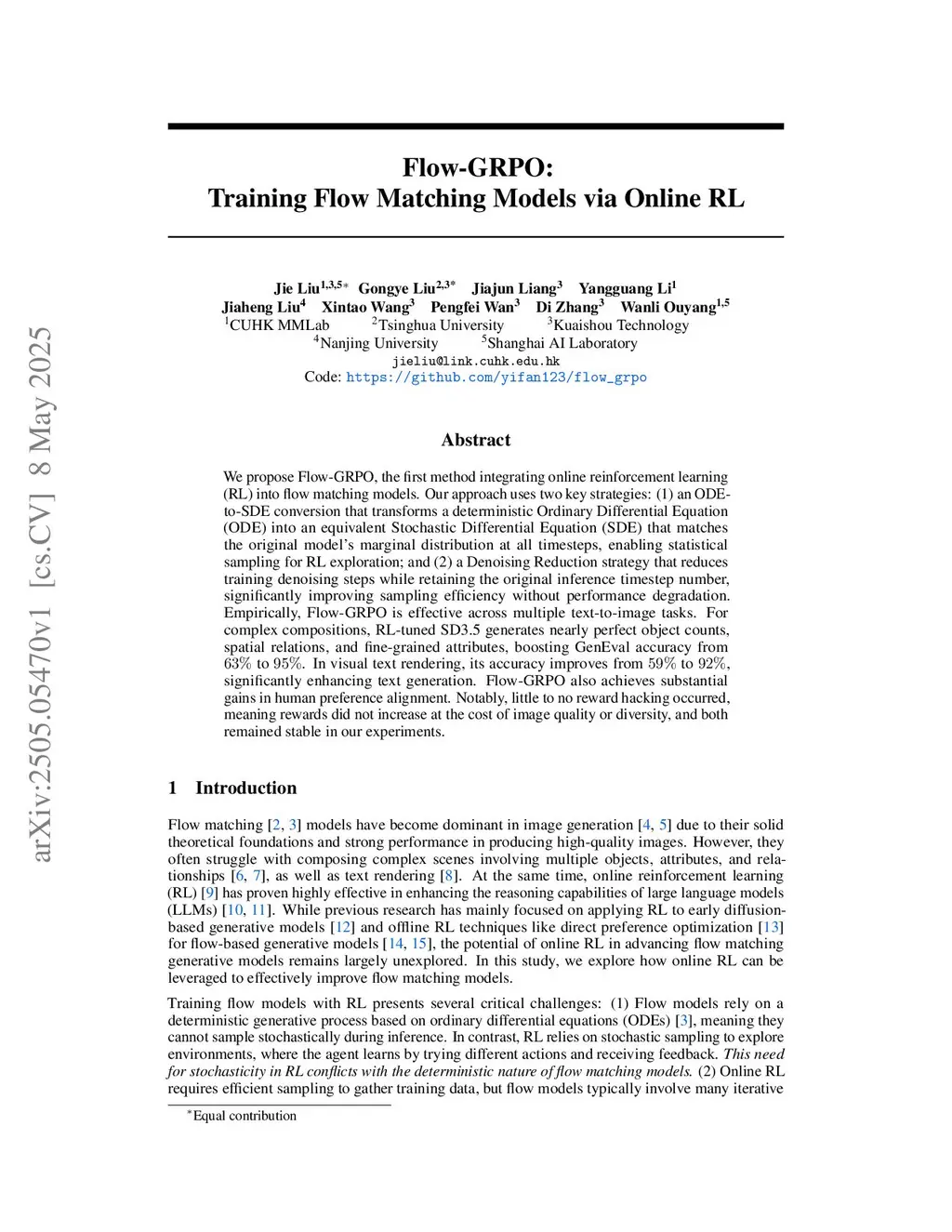 We propose Flow-GRPO, the first method to integrate online policy gradient reinforcement learning (RL) into flow matching models. Our approach uses two key strategies: (1) an ODE-to-SDE conversion that transforms a deterministic Ordinary Differential Equation (ODE) into an equivalent Stochastic Differential Equation (SDE) that matches the original model's marginal distribution at all timesteps, enabling statistical sampling for RL exploration; and (2) a Denoising Reduction strategy that reduces training denoising steps while retaining the original number of inference steps, significantly improving sampling efficiency without sacrificing performance. Empirically, Flow-GRPO is effective across multiple text-to-image tasks. For compositional generation, RL-tuned SD3.5-M generates nearly perfect object counts, spatial relations, and fine-grained attributes, increasing GenEval accuracy from to . In visual text rendering, accuracy improves from to , greatly enhancing text generation. Flow-GRPO also achieves substantial gains in human preference alignment. Notably, very little reward hacking occurred, meaning rewards did not increase at the cost of appreciable image quality or diversity degradation.