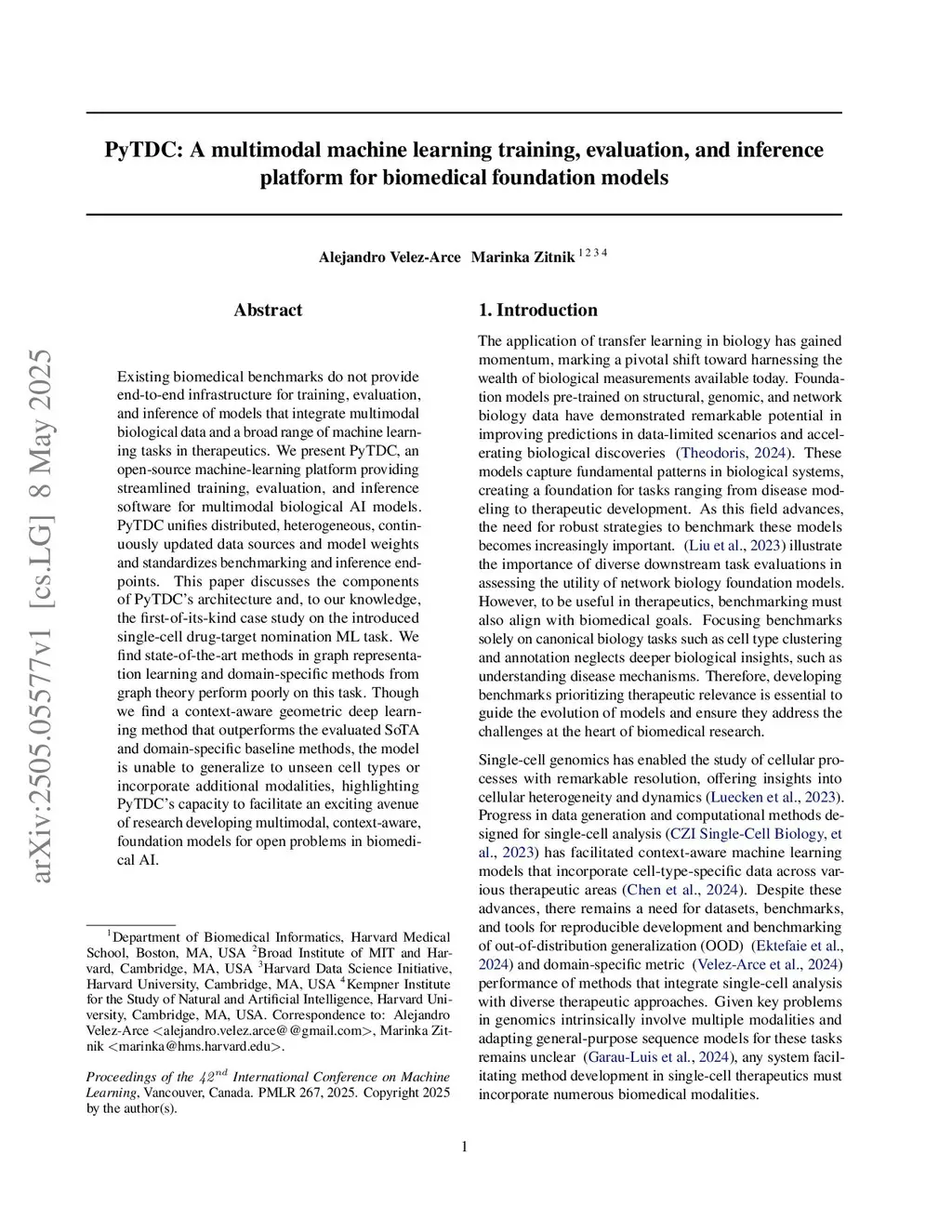 Existing biomedical benchmarks do not provide end-to-end infrastructure for training, evaluation, and inference of models that integrate multimodal biological data and a broad range of machine learning tasks in therapeutics. We present PyTDC, an open-source machine-learning platform providing streamlined training, evaluation, and inference software for multimodal biological AI models. PyTDC unifies distributed, heterogeneous, continuously updated data sources and model weights and standardizes benchmarking and inference endpoints. This paper discusses the components of PyTDC's architecture and, to our knowledge, the first-of-its-kind case study on the introduced single-cell drug-target nomination ML task. We find state-of-the-art methods in graph representation learning and domain-specific methods from graph theory perform poorly on this task. Though we find a context-aware geometric deep learning method that outperforms the evaluated SoTA and domain-specific baseline methods, the model is unable to generalize to unseen cell types or incorporate additional modalities, highlighting PyTDC's capacity to facilitate an exciting avenue of research developing multimodal, context-aware, foundation models for open problems in biomedical AI.