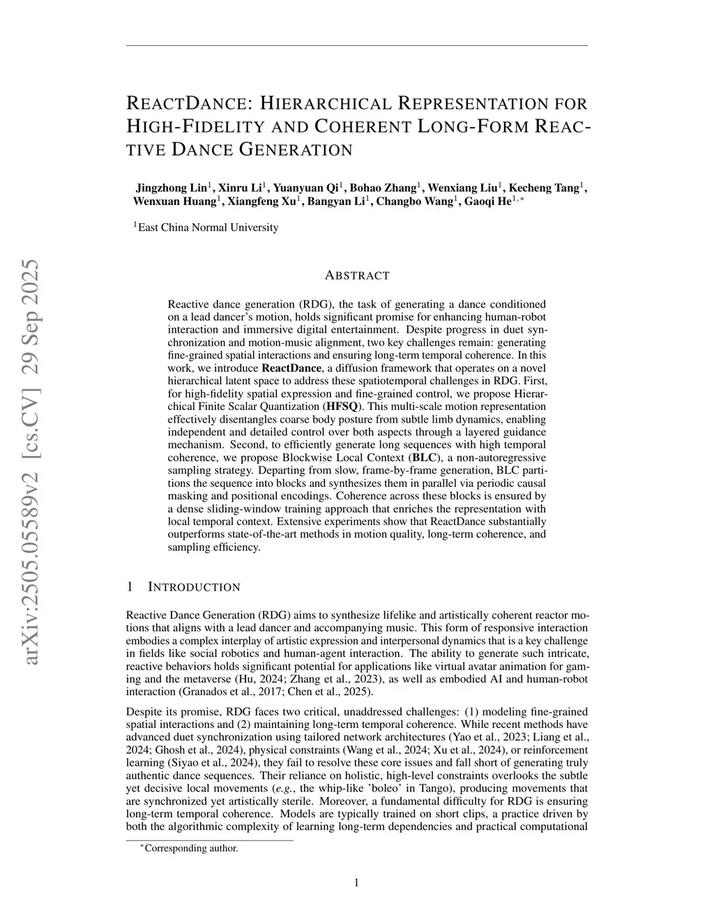 Reactive dance generation (RDG), the task of generating a dance conditioned on a lead dancer's motion, holds significant promise for enhancing human-robot interaction and immersive digital entertainment. Despite progress in duet synchronization and motion-music alignment, two key challenges remain: generating fine-grained spatial interactions and ensuring long-term temporal coherence. In this work, we introduce \textbf{ReactDance}, a diffusion framework that operates on a novel hierarchical latent space to address these spatiotemporal challenges in RDG. First, for high-fidelity spatial expression and fine-grained control, we propose Hierarchical Finite Scalar Quantization (\textbf{HFSQ}). This multi-scale motion representation effectively disentangles coarse body posture from subtle limb dynamics, enabling independent and detailed control over both aspects through a layered guidance mechanism. Second, to efficiently generate long sequences with high temporal coherence, we propose Blockwise Local Context (\textbf{BLC}), a non-autoregressive sampling strategy. Departing from slow, frame-by-frame generation, BLC partitions the sequence into blocks and synthesizes them in parallel via periodic causal masking and positional encodings. Coherence across these blocks is ensured by a dense sliding-window training approach that enriches the representation with local temporal context. Extensive experiments show that ReactDance substantially outperforms state-of-the-art methods in motion quality, long-term coherence, and sampling efficiency. Project page:this https URL.