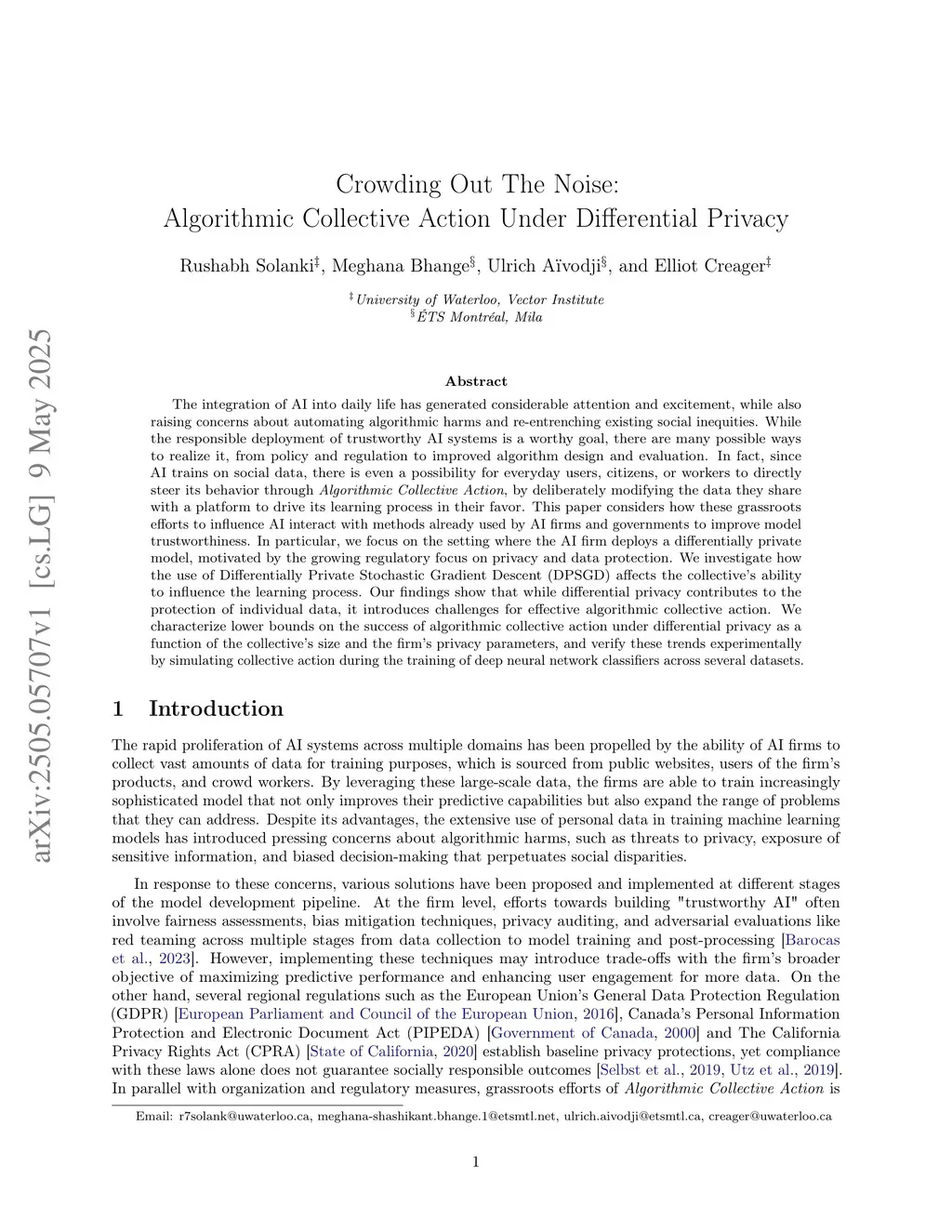 The integration of AI into daily life has generated considerable attention and excitement, while also raising concerns about automating algorithmic harms and re-entrenching existing social inequities. While the responsible deployment of trustworthy AI systems is a worthy goal, there are many possible ways to realize it, from policy and regulation to improved algorithm design and evaluation. In fact, since AI trains on social data, there is even a possibility for everyday users, citizens, or workers to directly steer its behavior through Algorithmic Collective Action, by deliberately modifying the data they share with a platform to drive its learning process in their favor. This paper considers how these grassroots efforts to influence AI interact with methods already used by AI firms and governments to improve model trustworthiness. In particular, we focus on the setting where the AI firm deploys a differentially private model, motivated by the growing regulatory focus on privacy and data protection. We investigate how the use of Differentially Private Stochastic Gradient Descent (DPSGD) affects the collective's ability to influence the learning process. Our findings show that while differential privacy contributes to the protection of individual data, it introduces challenges for effective algorithmic collective action. We characterize lower bounds on the success of algorithmic collective action under differential privacy as a function of the collective's size and the firm's privacy parameters, and verify these trends experimentally by simulating collective action during the training of deep neural network classifiers across several datasets.
