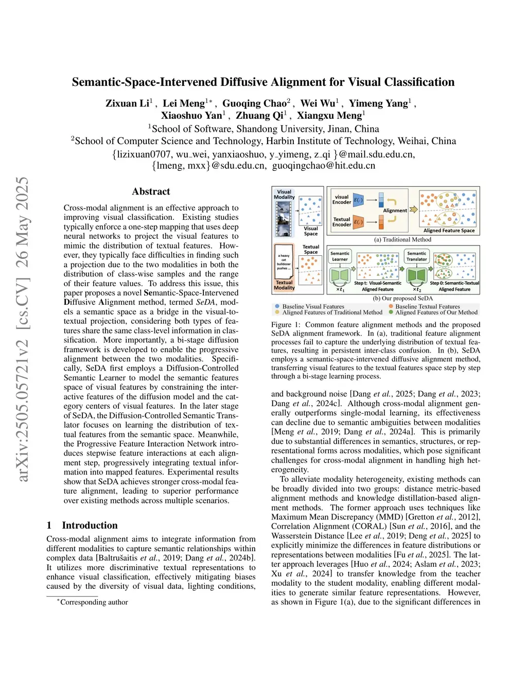 Cross-modal alignment is an effective approach to improving visual classification. Existing studies typically enforce a one-step mapping that uses deep neural networks to project the visual features to mimic the distribution of textual features. However, they typically face difficulties in finding such a projection due to the two modalities in both the distribution of class-wise samples and the range of their feature values. To address this issue, this paper proposes a novel Semantic-Space-Intervened Diffusive Alignment method, termed SeDA, models a semantic space as a bridge in the visual-to-textual projection, considering both types of features share the same class-level information in classification. More importantly, a bi-stage diffusion framework is developed to enable the progressive alignment between the two modalities. Specifically, SeDA first employs a Diffusion-Controlled Semantic Learner to model the semantic features space of visual features by constraining the interactive features of the diffusion model and the category centers of visual features. In the later stage of SeDA, the Diffusion-Controlled Semantic Translator focuses on learning the distribution of textual features from the semantic space. Meanwhile, the Progressive Feature Interaction Network introduces stepwise feature interactions at each alignment step, progressively integrating textual information into mapped features. Experimental results show that SeDA achieves stronger cross-modal feature alignment, leading to superior performance over existing methods across multiple scenarios.