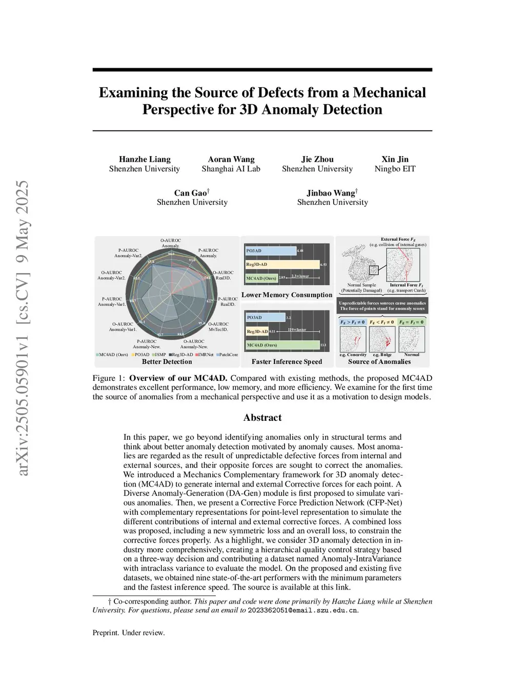 In this paper, we explore a novel approach to 3D anomaly detection (AD) that goes beyond merely identifying anomalies based on structural characteristics. Our primary perspective is that most anomalies arise from unpredictable defective forces originating from both internal and external sources. To address these anomalies, we seek out opposing forces that can help correct them. Therefore, we introduce the Mechanics Complementary Model-based Framework for the 3D-AD task (MC4AD), which generates internal and external corrective forces for each point. We first propose a Diverse Anomaly-Generation (DA-Gen) module designed to simulate various types of anomalies. Next, we present the Corrective Force Prediction Network (CFP-Net), which uses complementary representations for point-level analysis to simulate the different contributions from internal and external corrective forces. To ensure the corrective forces are constrained effectively, we have developed a combined loss function that includes a new symmetric loss and an overall loss. Notably, we implement a Hierarchical Quality Control (HQC) strategy based on a three-way decision process and contribute a dataset titled Anomaly-IntraVariance, which incorporates intraclass variance to evaluate our model. As a result, the proposed MC4AD has been proven effective through theory and experimentation. The experimental results demonstrate that our approach yields nine state-of-the-art performances, achieving optimal results with minimal parameters and the fastest inference speed across five existing datasets, in addition to the proposed Anomaly-IntraVariance dataset. The source is available atthis https URL