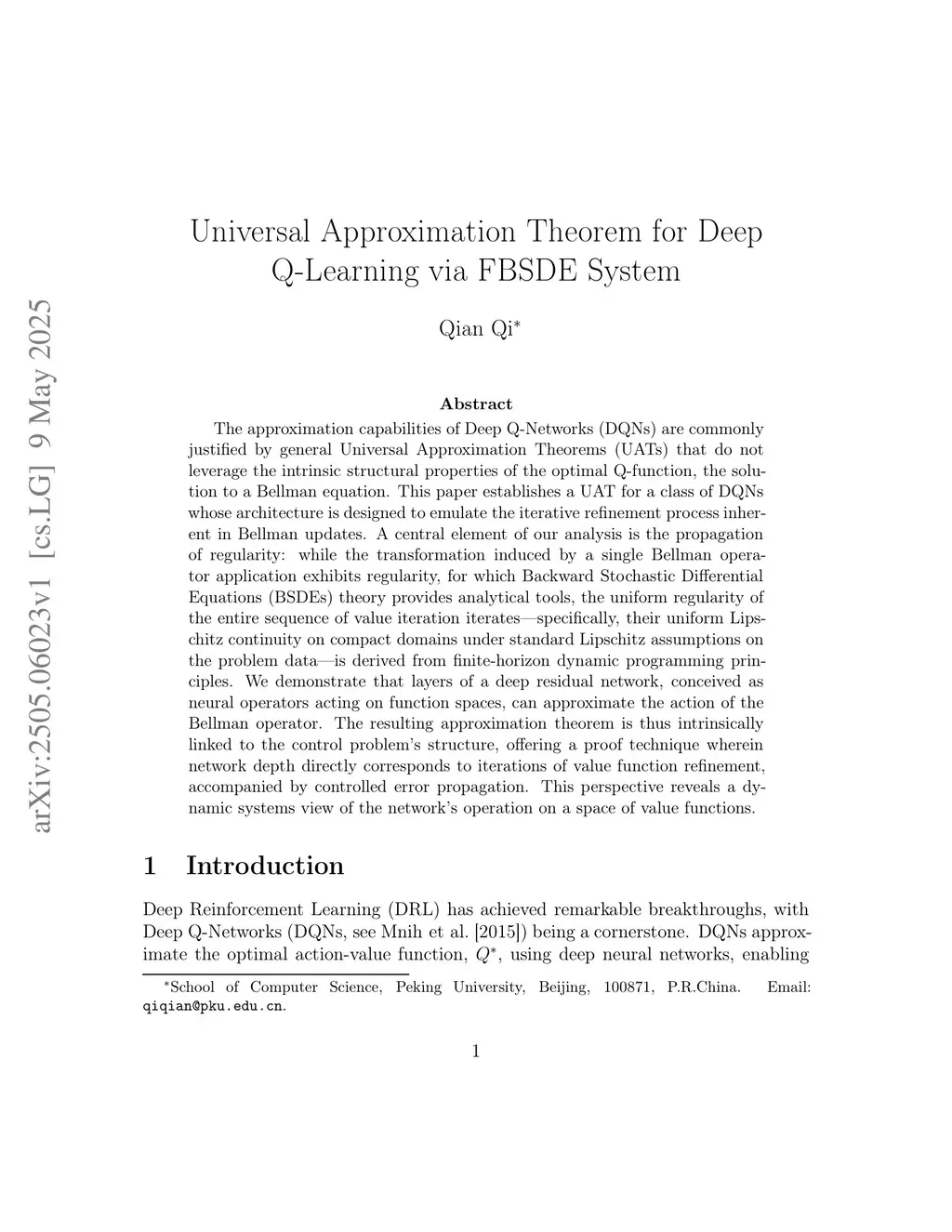 The approximation capabilities of Deep Q-Networks (DQNs) are commonly justified by general Universal Approximation Theorems (UATs) that do not leverage the intrinsic structural properties of the optimal Q-function, the solution to a Bellman equation. This paper establishes a UAT for a class of DQNs whose architecture is designed to emulate the iterative refinement process inherent in Bellman updates. A central element of our analysis is the propagation of regularity: while the transformation induced by a single Bellman operator application exhibits regularity, for which Backward Stochastic Differential Equations (BSDEs) theory provides analytical tools, the uniform regularity of the entire sequence of value iteration iterates--specifically, their uniform Lipschitz continuity on compact domains under standard Lipschitz assumptions on the problem data--is derived from finite-horizon dynamic programming principles. We demonstrate that layers of a deep residual network, conceived as neural operators acting on function spaces, can approximate the action of the Bellman operator. The resulting approximation theorem is thus intrinsically linked to the control problem's structure, offering a proof technique wherein network depth directly corresponds to iterations of value function refinement, accompanied by controlled error propagation. This perspective reveals a dynamic systems view of the network's operation on a space of value functions.
