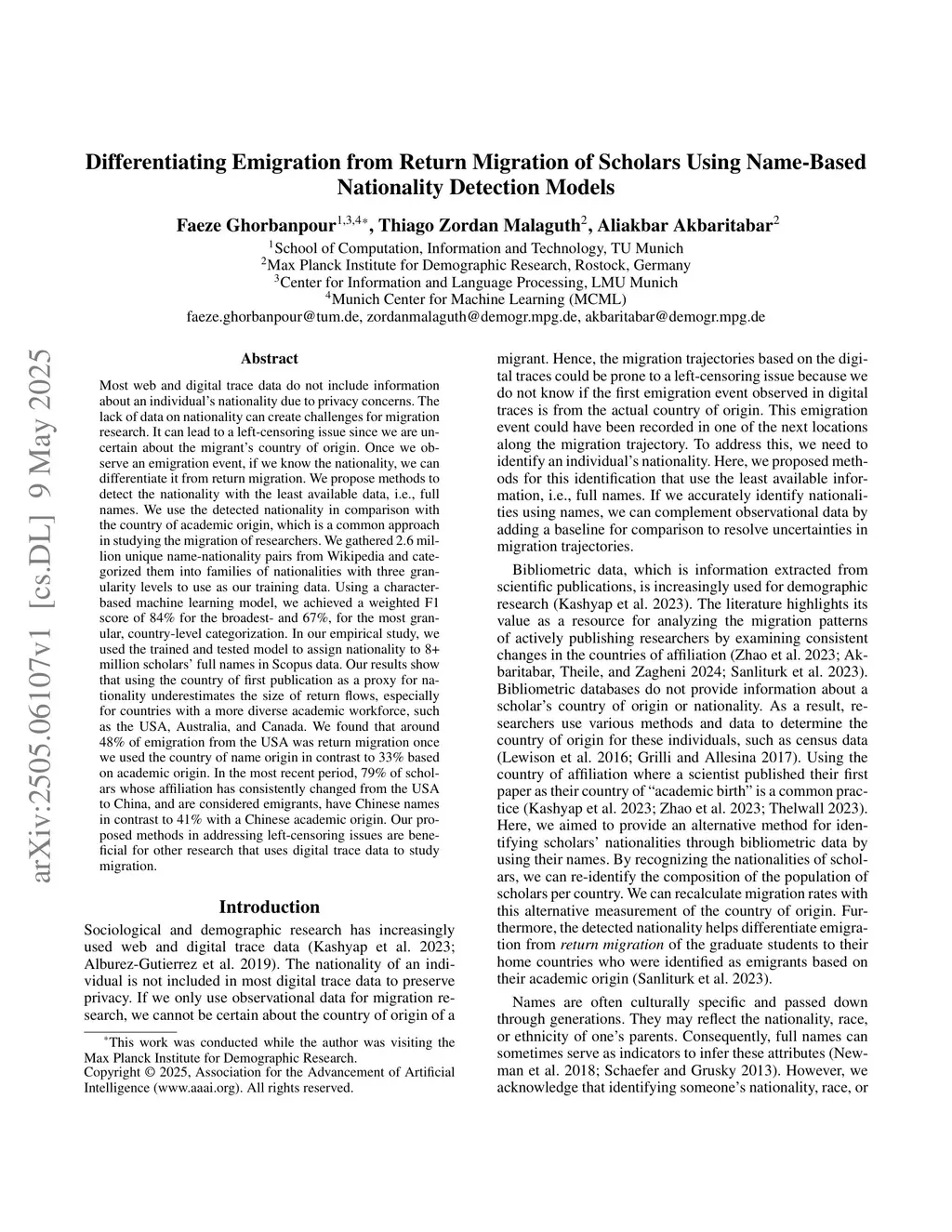 Differentiating Emigration from Return Migration of Scholars Using Name-Based Nationality Detection Models