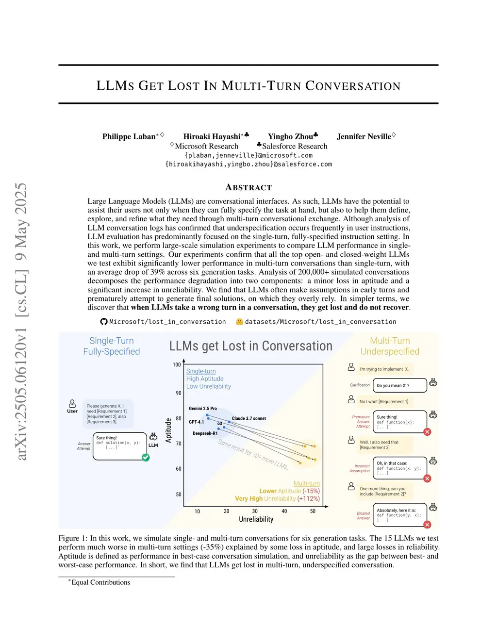 LLMs Get Lost In Multi-Turn Conversation
