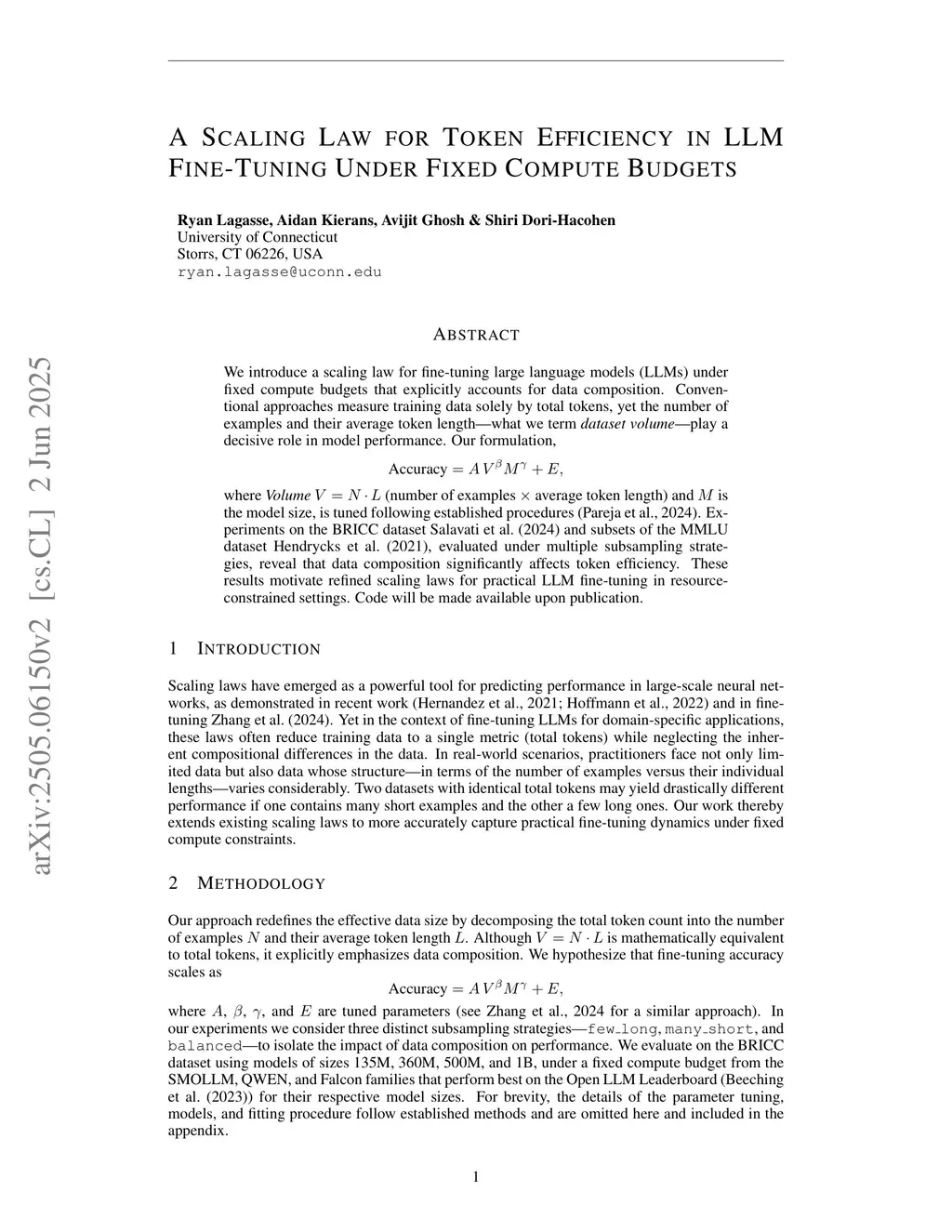 We introduce a scaling law for fine-tuning large language models (LLMs) under fixed compute budgets that explicitly accounts for data composition. Conventional approaches measure training data solely by total tokens, yet the number of examples and their average token length -- what we term \emph{dataset volume} -- play a decisive role in model performance. Our formulation is tuned following established procedures. Experiments on the BRICC dataset \cite{salavati2024reducing} and subsets of the MMLU dataset \cite{hendrycks2021measuringmassivemultitasklanguage}, evaluated under multiple subsampling strategies, reveal that data composition significantly affects token efficiency. These results motivate refined scaling laws for practical LLM fine-tuning in resource-constrained settings.