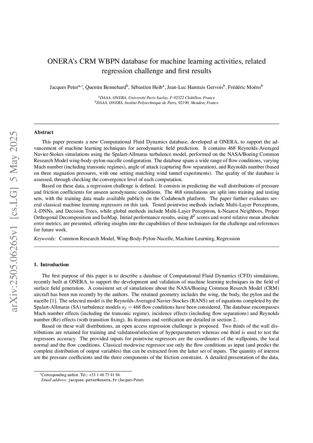 This paper presents a new Computational Fluid Dynamics database, developed at ONERA, to support the advancement of machine learning techniques for aerodynamic field prediction. It contains 468 Reynolds-Averaged Navier-Stokes simulations using the Spalart-Allmaras turbulence model, performed on the NASA/Boeing Common Research Model wing-body-pylon-nacelle configuration. The database spans a wide range of flow conditions, varying Mach number (including transonic regimes), angle of attack (capturing flow separation), and Reynolds number (based on three stagnation pressures, with one setting matching wind tunnel experiments). The quality of the database is assessed, through checking the convergence level of each computation.Based on these data, a regression challenge is defined. It consists in predicting the wall distributions of pressure and friction coefficients for unseen aerodynamic conditions. The 468 simulations are split into training and testing sets, with the training data made available publicly on the Codabench platform. The paper further evaluates several classical machine learning regressors on this task. Tested pointwise methods include Multi-Layer Perceptrons, -DNNs, and Decision Trees, while global methods include Multi-Layer Perceptron, k-Nearest Neighbors, Proper Orthogonal Decomposition and IsoMap. Initial performance results, using scores and worst relative mean absolute error metrics, are presented, offering insights into the capabilities of these techniques for the challenge and references for future work.