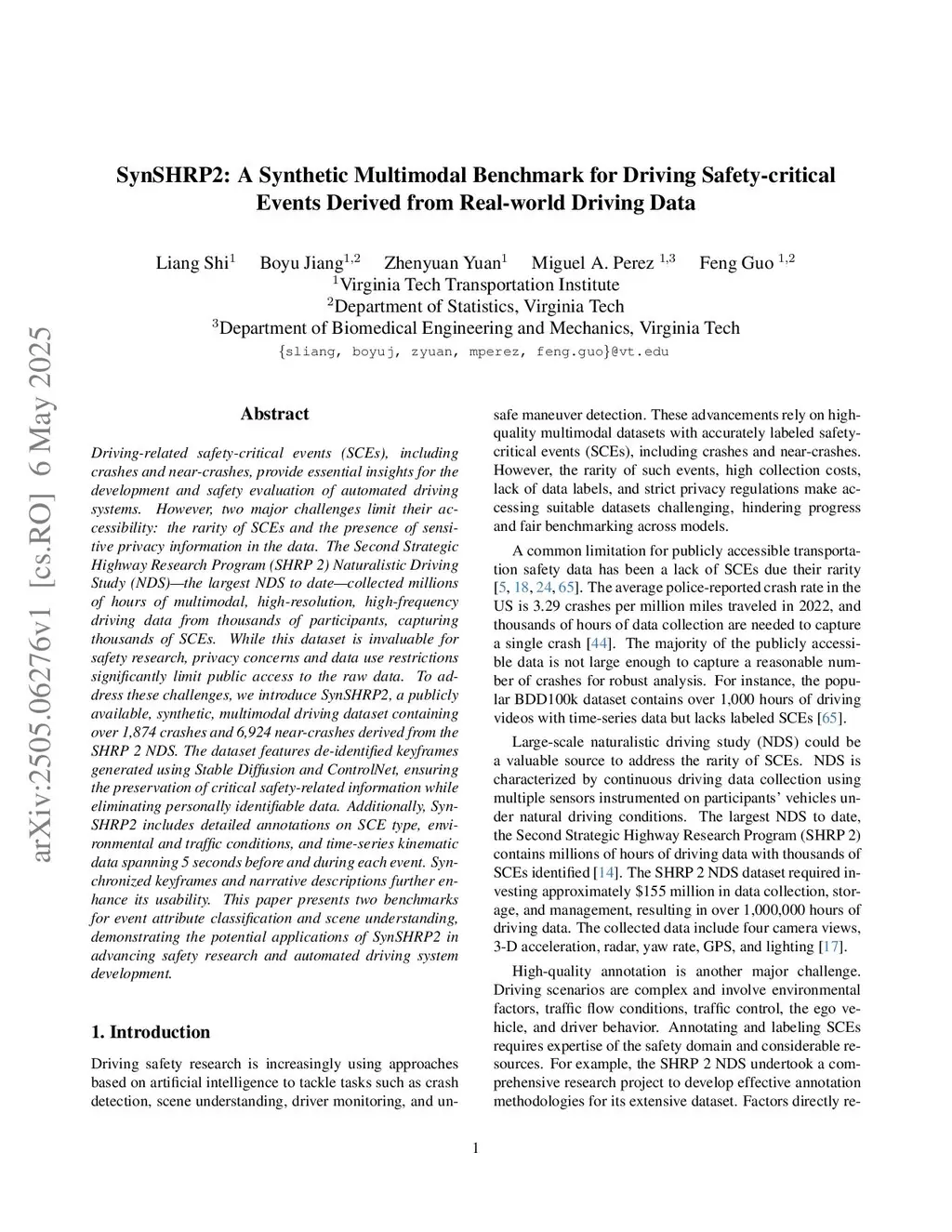 Driving-related safety-critical events (SCEs), including crashes and near-crashes, provide essential insights for the development and safety evaluation of automated driving systems. However, two major challenges limit their accessibility: the rarity of SCEs and the presence of sensitive privacy information in the data. The Second Strategic Highway Research Program (SHRP 2) Naturalistic Driving Study (NDS), the largest NDS to date, collected millions of hours of multimodal, high-resolution, high-frequency driving data from thousands of participants, capturing thousands of SCEs. While this dataset is invaluable for safety research, privacy concerns and data use restrictions significantly limit public access to the raw data. To address these challenges, we introduce SynSHRP2, a publicly available, synthetic, multimodal driving dataset containing over 1874 crashes and 6924 near-crashes derived from the SHRP 2 NDS. The dataset features de-identified keyframes generated using Stable Diffusion and ControlNet, ensuring the preservation of critical safety-related information while eliminating personally identifiable data. Additionally, SynSHRP2 includes detailed annotations on SCE type, environmental and traffic conditions, and time-series kinematic data spanning 5 seconds before and during each event. Synchronized keyframes and narrative descriptions further enhance its usability. This paper presents two benchmarks for event attribute classification and scene understanding, demonstrating the potential applications of SynSHRP2 in advancing safety research and automated driving system development.