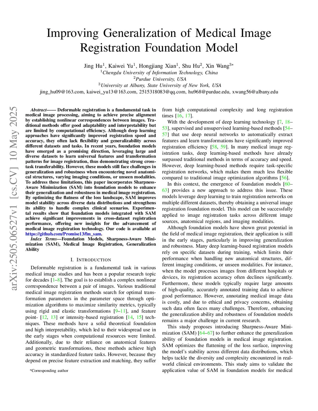 Deformable registration is a fundamental task in medical image processing, aiming to achieve precise alignment by establishing nonlinear correspondences between images. Traditional methods offer good adaptability and interpretability but are limited by computational efficiency. Although deep learning approaches have significantly improved registration speed and accuracy, they often lack flexibility and generalizability across different datasets and tasks. In recent years, foundation models have emerged as a promising direction, leveraging large and diverse datasets to learn universal features and transformation patterns for image registration, thus demonstrating strong cross-task transferability. However, these models still face challenges in generalization and robustness when encountering novel anatomical structures, varying imaging conditions, or unseen modalities. To address these limitations, this paper incorporates Sharpness-Aware Minimization (SAM) into foundation models to enhance their generalization and robustness in medical image registration. By optimizing the flatness of the loss landscape, SAM improves model stability across diverse data distributions and strengthens its ability to handle complex clinical scenarios. Experimental results show that foundation models integrated with SAM achieve significant improvements in cross-dataset registration performance, offering new insights for the advancement of medical image registration technology. Our code is available atthis https URL}{this https URL\_sam.