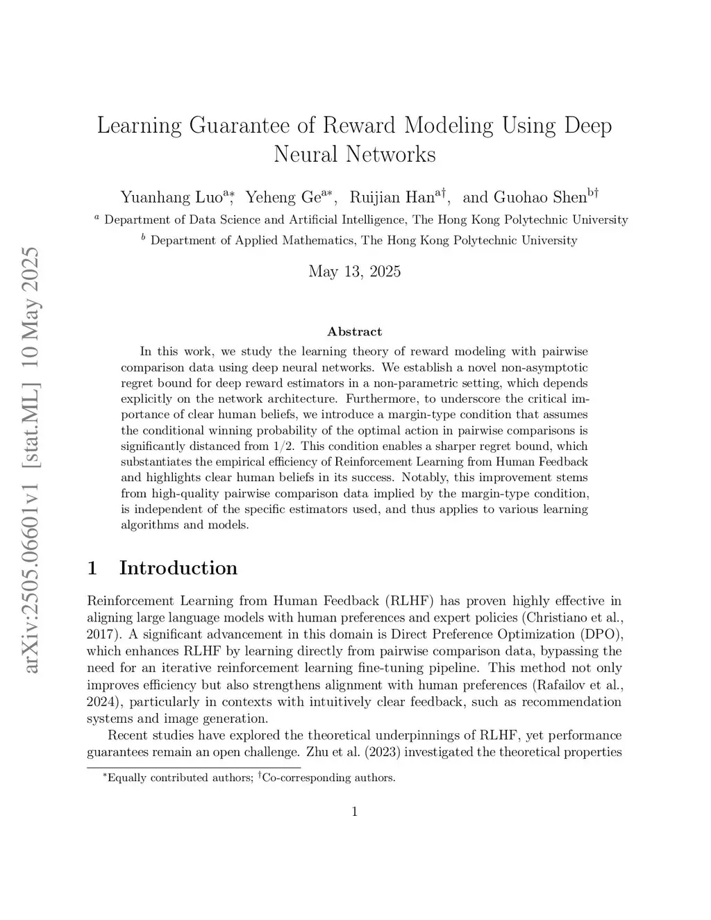 In this work, we study the learning theory of reward modeling with pairwise comparison data using deep neural networks. We establish a novel non-asymptotic regret bound for deep reward estimators in a non-parametric setting, which depends explicitly on the network architecture. Furthermore, to underscore the critical importance of clear human beliefs, we introduce a margin-type condition that assumes the conditional winning probability of the optimal action in pairwise comparisons is significantly distanced from 1/2. This condition enables a sharper regret bound, which substantiates the empirical efficiency of Reinforcement Learning from Human Feedback and highlights clear human beliefs in its success. Notably, this improvement stems from high-quality pairwise comparison data implied by the margin-type condition, is independent of the specific estimators used, and thus applies to various learning algorithms and models.