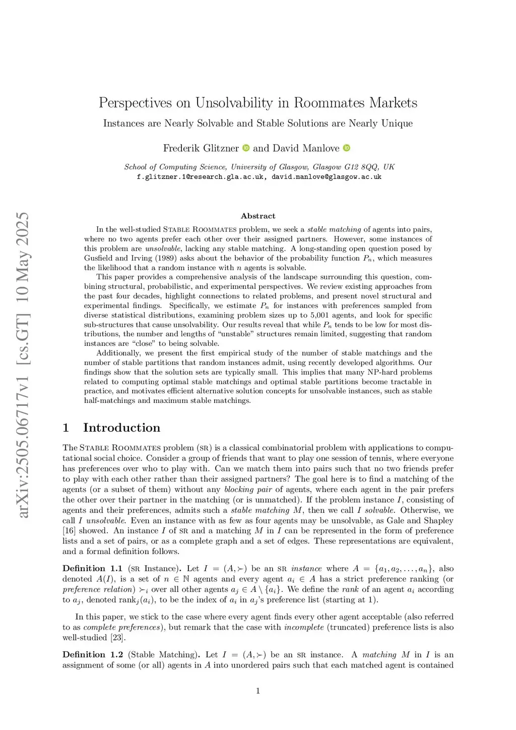 In the well-studied Stable Roommates problem, we seek a stable matching of agents into pairs, where no two agents prefer each other over their assigned partners. However, some instances of this problem are unsolvable, lacking any stable matching. A long-standing open question posed by Gusfield and Irving (1989) asks about the behavior of the probability function Pn, which measures the likelihood that a random instance with n agents is solvable.