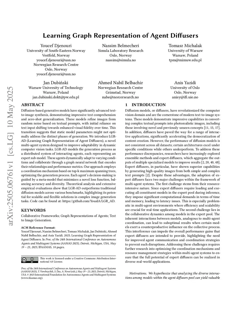 Diffusion-based generative models have significantly advanced text-to-image synthesis, demonstrating impressive text comprehension and zero-shot generalization. These models refine images from random noise based on textual prompts, with initial reliance on text input shifting towards enhanced visual fidelity over time. This transition suggests that static model parameters might not optimally address the distinct phases of generation. We introduce LGR-AD (Learning Graph Representation of Agent Diffusers), a novel multi-agent system designed to improve adaptability in dynamic computer vision tasks. LGR-AD models the generation process as a distributed system of interacting agents, each representing an expert sub-model. These agents dynamically adapt to varying conditions and collaborate through a graph neural network that encodes their relationships and performance metrics. Our approach employs a coordination mechanism based on top- maximum spanning trees, optimizing the generation process. Each agent's decision-making is guided by a meta-model that minimizes a novel loss function, balancing accuracy and diversity. Theoretical analysis and extensive empirical evaluations show that LGR-AD outperforms traditional diffusion models across various benchmarks, highlighting its potential for scalable and flexible solutions in complex image generation tasks. Code is available at:this https URL