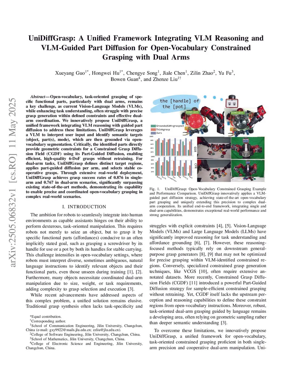 Open-vocabulary, task-oriented grasping of specific functional parts, particularly with dual arms, remains a key challenge, as current Vision-Language Models (VLMs), while enhancing task understanding, often struggle with precise grasp generation within defined constraints and effective dual-arm coordination. We innovatively propose UniDiffGrasp, a unified framework integrating VLM reasoning with guided part diffusion to address these limitations. UniDiffGrasp leverages a VLM to interpret user input and identify semantic targets (object, part(s), mode), which are then grounded via open-vocabulary segmentation. Critically, the identified parts directly provide geometric constraints for a Constrained Grasp Diffusion Field (CGDF) using its Part-Guided Diffusion, enabling efficient, high-quality 6-DoF grasps without retraining. For dual-arm tasks, UniDiffGrasp defines distinct target regions, applies part-guided diffusion per arm, and selects stable cooperative grasps. Through extensive real-world deployment, UniDiffGrasp achieves grasp success rates of 0.876 in single-arm and 0.767 in dual-arm scenarios, significantly surpassing existing state-of-the-art methods, demonstrating its capability to enable precise and coordinated open-vocabulary grasping in complex real-world scenarios.