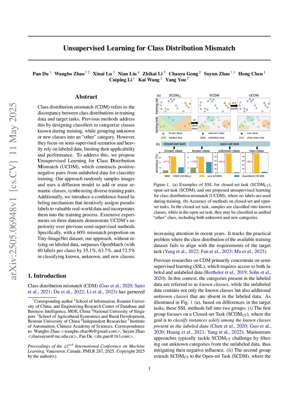 Class distribution mismatch (CDM) refers to the discrepancy between class distributions in training data and target tasks. Previous methods address this by designing classifiers to categorize classes known during training, while grouping unknown or new classes into an "other" category. However, they focus on semi-supervised scenarios and heavily rely on labeled data, limiting their applicability and performance. To address this, we propose Unsupervised Learning for Class Distribution Mismatch (UCDM), which constructs positive-negative pairs from unlabeled data for classifier training. Our approach randomly samples images and uses a diffusion model to add or erase semantic classes, synthesizing diverse training pairs. Additionally, we introduce a confidence-based labeling mechanism that iteratively assigns pseudo-labels to valuable real-world data and incorporates them into the training process. Extensive experiments on three datasets demonstrate UCDM's superiority over previous semi-supervised methods. Specifically, with a 60% mismatch proportion on Tiny-ImageNet dataset, our approach, without relying on labeled data, surpasses OpenMatch (with 40 labels per class) by 35.1%, 63.7%, and 72.5% in classifying known, unknown, and new classes.
