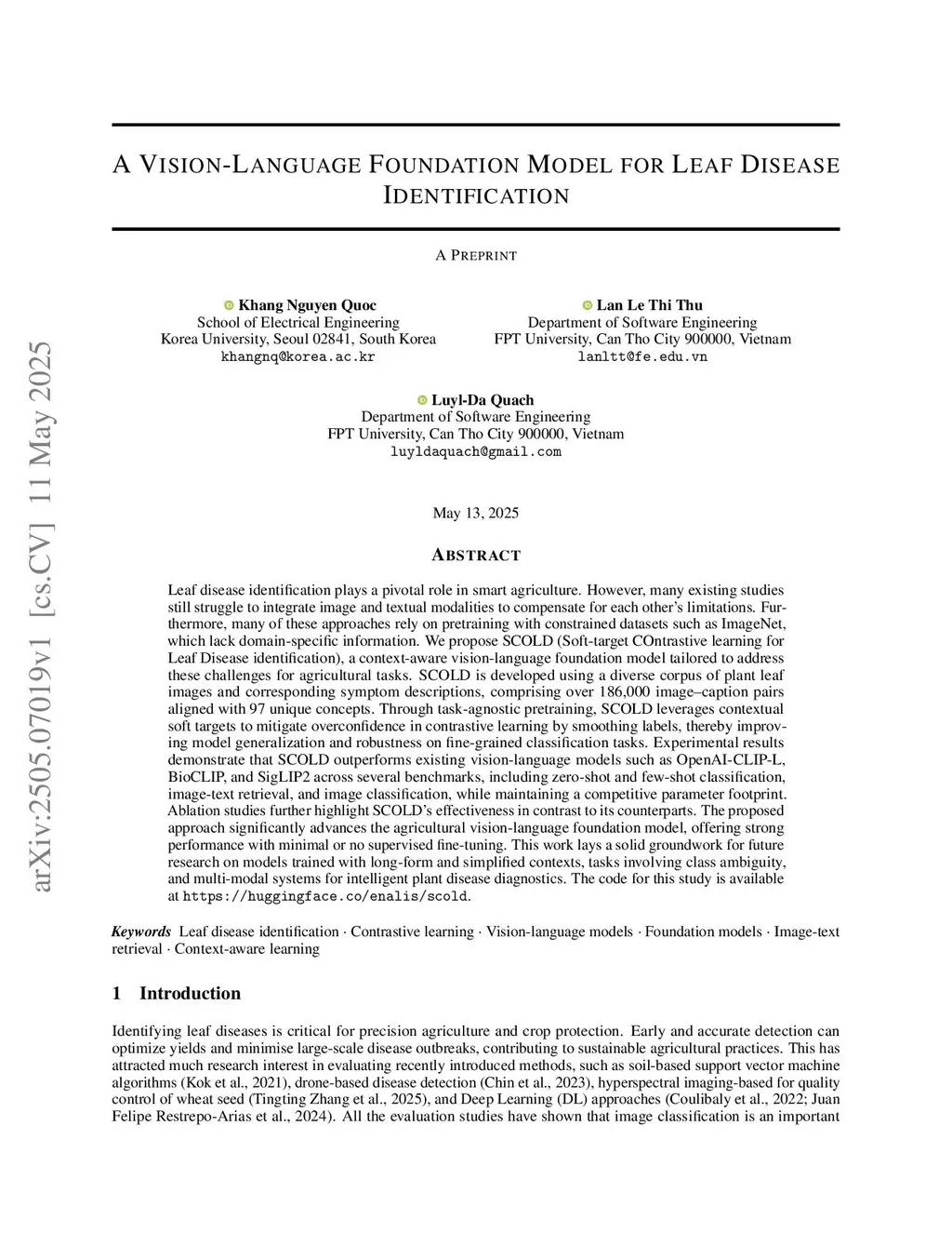 Leaf disease identification plays a pivotal role in smart agriculture. However, many existing studies still struggle to integrate image and textual modalities to compensate for each other's limitations. Furthermore, many of these approaches rely on pretraining with constrained datasets such as ImageNet, which lack domain-specific information. We propose SCOLD (Soft-target COntrastive learning for Leaf Disease identification), a context-aware vision-language foundation model tailored to address these challenges for agricultural tasks. SCOLD is developed using a diverse corpus of plant leaf images and corresponding symptom descriptions, comprising over 186,000 image-caption pairs aligned with 97 unique concepts. Through task-agnostic pretraining, SCOLD leverages contextual soft targets to mitigate overconfidence in contrastive learning by smoothing labels, thereby improving model generalization and robustness on fine-grained classification tasks. Experimental results demonstrate that SCOLD outperforms existing vision-language models such as OpenAI-CLIP-L, BioCLIP, and SigLIP2 across several benchmarks, including zero-shot and few-shot classification, image-text retrieval, and image classification, while maintaining a competitive parameter footprint. Ablation studies further highlight SCOLD's effectiveness in contrast to its counterparts. The proposed approach significantly advances the agricultural vision-language foundation model, offering strong performance with minimal or no supervised fine-tuning. This work lays a solid groundwork for future research on models trained with long-form and simplified contexts, tasks involving class ambiguity, and multi-modal systems for intelligent plant disease diagnostics. The code for this study is available atthis https URL