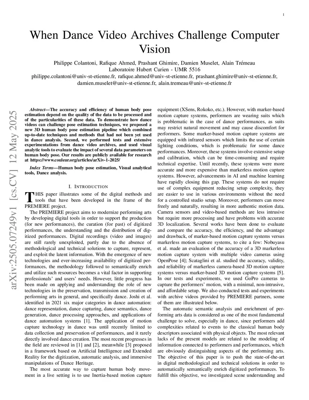 The accuracy and efficiency of human body pose estimation depend on the quality of the data to be processed and of the particularities of these data. To demonstrate how dance videos can challenge pose estimation techniques, we proposed a new 3D human body pose estimation pipeline which combined up-to-date techniques and methods that had not been yet used in dance analysis. Second, we performed tests and extensive experimentations from dance video archives, and used visual analytic tools to evaluate the impact of several data parameters on human body pose. Our results are publicly available for research atthis https URL