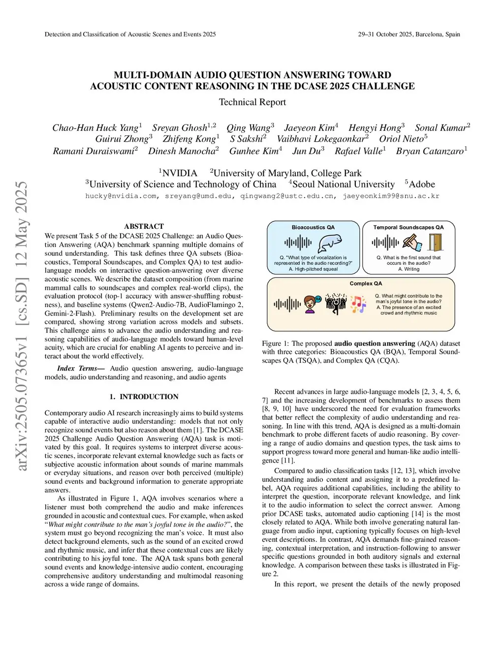 We present Task 5 of the DCASE 2025 Challenge: an Audio Question Answering (AQA) benchmark spanning multiple domains of sound understanding. This task defines three QA subsets (Bioacoustics, Temporal Soundscapes, and Complex QA) to test audio-language models on interactive question-answering over diverse acoustic scenes. We describe the dataset composition (from marine mammal calls to soundscapes and complex real-world clips), the evaluation protocol (top-1 accuracy with answer-shuffling robustness), and baseline systems (Qwen2-Audio-7B, AudioFlamingo 2, Gemini-2-Flash). Preliminary results on the development set are compared, showing strong variation across models and subsets. This challenge aims to advance the audio understanding and reasoning capabilities of audio-language models toward human-level acuity, which are crucial for enabling AI agents to perceive and interact about the world effectively.