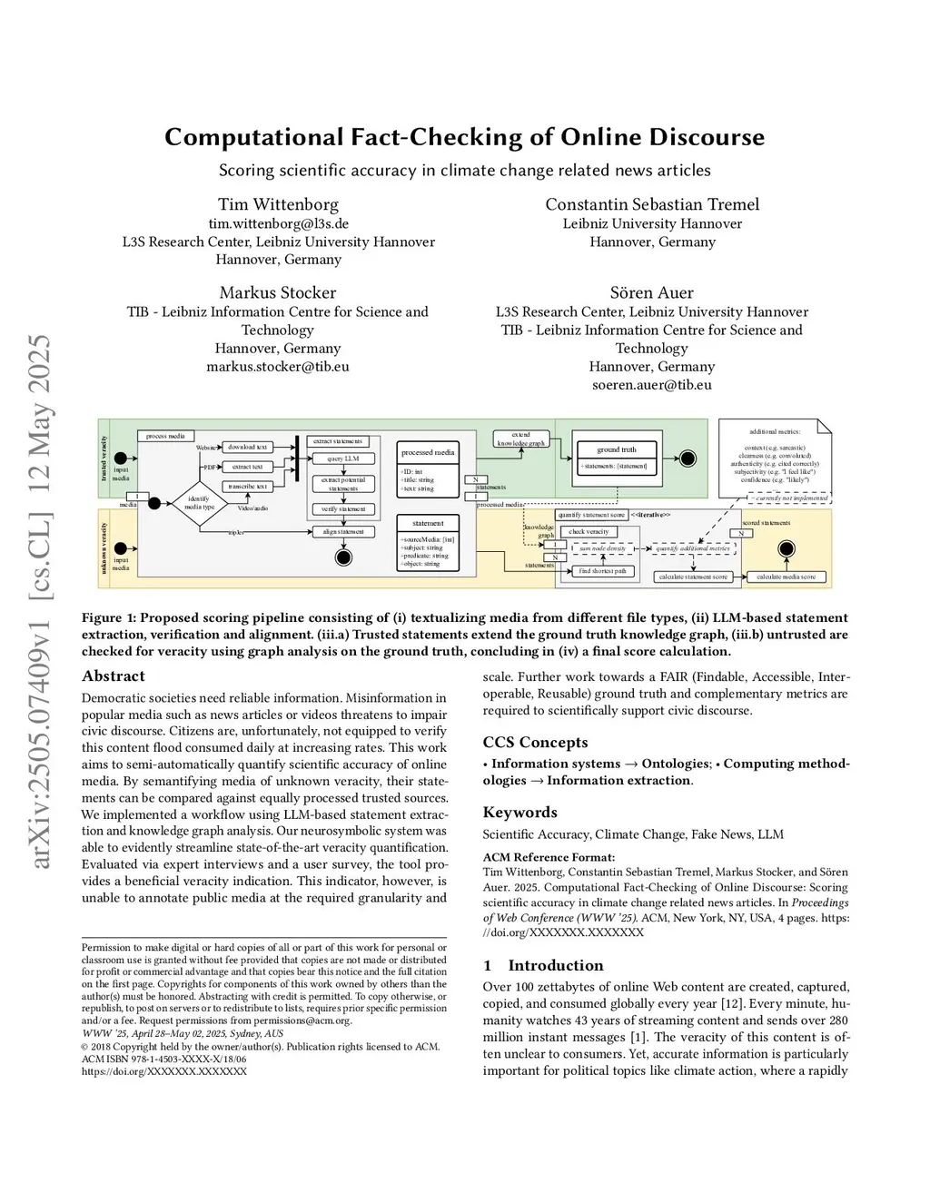 Democratic societies need reliable information. Misinformation in popular media, such as news articles or videos, threatens to impair civic discourse. Citizens are, unfortunately, not equipped to verify the flood of content consumed daily at increasing rates. This work aims to quantify the scientific accuracy of online media semi-automatically. We investigate the state of the art of climate-related ground truth knowledge representation. By semantifying media content of unknown veracity, their statements can be compared against these ground truth knowledge graphs. We implemented a workflow using LLM-based statement extraction and knowledge graph analysis. Our implementation can streamline content processing towards state-of-the-art knowledge representation and veracity quantification. Developed and evaluated with the help of 27 experts and detailed interviews with 10, the tool evidently provides a beneficial veracity indication. These findings are supported by 43 anonymous participants from a parallel user survey. This initial step, however, is unable to annotate public media at the required granularity and scale. Additionally, the identified state of climate change knowledge graphs is vastly insufficient to support this neurosymbolic fact-checking approach. Further work towards a FAIR (Findable, Accessible, Interoperable, Reusable) ground truth and complementary metrics is required to support civic discourse scientifically.