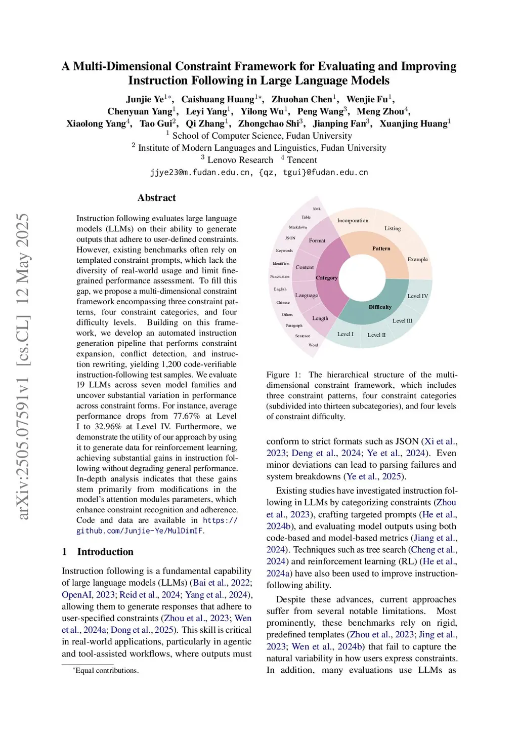 Instruction following evaluates large language models (LLMs) on their ability to generate outputs that adhere to user-defined constraints. However, existing benchmarks often rely on templated constraint prompts, which lack the diversity of real-world usage and limit fine-grained performance assessment. To fill this gap, we propose a multi-dimensional constraint framework encompassing three constraint patterns, four constraint categories, and four difficulty levels. Building on this framework, we develop an automated instruction generation pipeline that performs constraint expansion, conflict detection, and instruction rewriting, yielding 1,200 code-verifiable instruction-following test samples. We evaluate 19 LLMs across seven model families and uncover substantial variation in performance across constraint forms. For instance, average performance drops from 77.67% at Level I to 32.96% at Level IV. Furthermore, we demonstrate the utility of our approach by using it to generate data for reinforcement learning, achieving substantial gains in instruction following without degrading general performance. In-depth analysis indicates that these gains stem primarily from modifications in the model's attention modules parameters, which enhance constraint recognition and adherence. Code and data are available inthis https URL.
