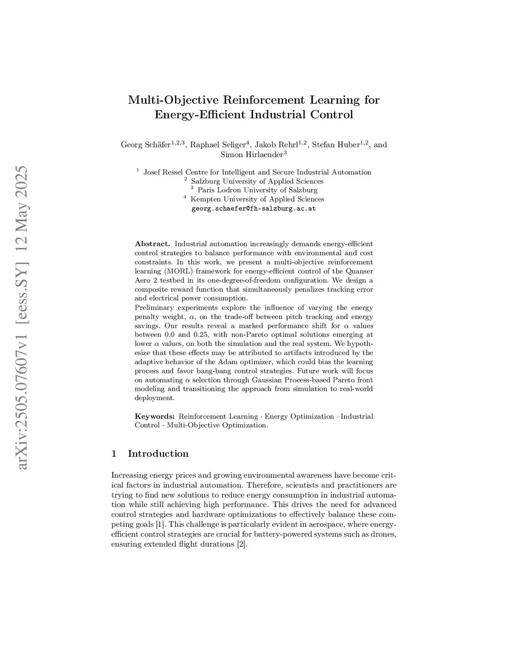 Industrial automation increasingly demands energy-efficient control strategies to balance performance with environmental and cost constraints. In this work, we present a multi-objective reinforcement learning (MORL) framework for energy-efficient control of the Quanser Aero 2 testbed in its one-degree-of-freedom configuration. We design a composite reward function that simultaneously penalizes tracking error and electrical power consumption. Preliminary experiments explore the influence of varying the Energy penalty weight, alpha, on the trade-off between pitch tracking and energy savings. Our results reveal a marked performance shift for alpha values between 0.0 and 0.25, with non-Pareto optimal solutions emerging at lower alpha values, on both the simulation and the real system. We hypothesize that these effects may be attributed to artifacts introduced by the adaptive behavior of the Adam optimizer, which could bias the learning process and favor bang-bang control strategies. Future work will focus on automating alpha selection through Gaussian Process-based Pareto front modeling and transitioning the approach from simulation to real-world deployment.