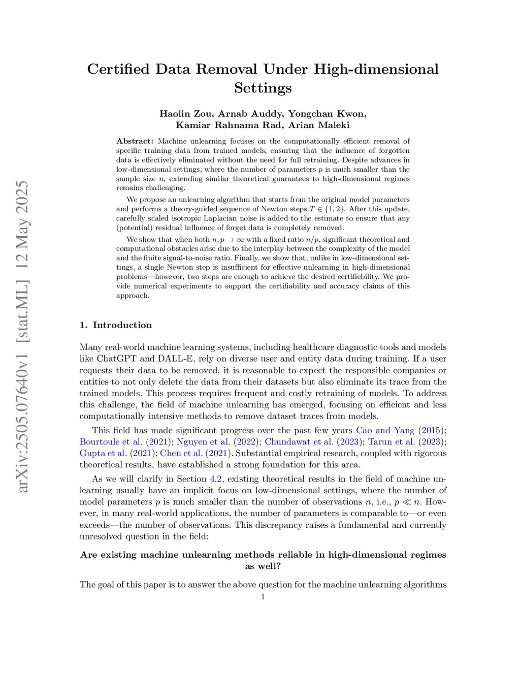 Machine unlearning focuses on the computationally efficient removal of specific training data from trained models, ensuring that the influence of forgotten data is effectively eliminated without the need for full retraining. Despite advances in low-dimensional settings, where the number of parameters \( p \) is much smaller than the sample size \( n \), extending similar theoretical guarantees to high-dimensional regimes remains challenging. We propose an unlearning algorithm that starts from the original model parameters and performs a theory-guided sequence of Newton steps \( T \in \{ 1,2\}\). After this update, carefully scaled isotropic Laplacian noise is added to the estimate to ensure that any (potential) residual influence of forget data is completely removed. We show that when both \( n, p \to \infty \) with a fixed ratio \( n/p \), significant theoretical and computational obstacles arise due to the interplay between the complexity of the model and the finite signal-to-noise ratio. Finally, we show that, unlike in low-dimensional settings, a single Newton step is insufficient for effective unlearning in high-dimensional problems -- however, two steps are enough to achieve the desired certifiebility. We provide numerical experiments to support the certifiability and accuracy claims of this approach.
