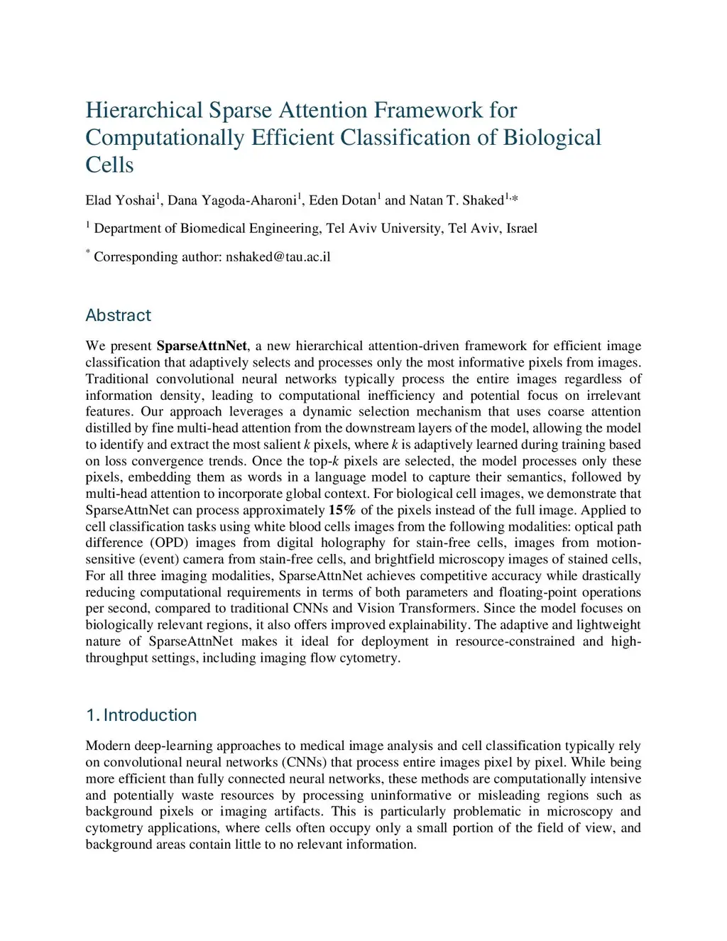 We present SparseAttnNet, a new hierarchical attention-driven framework for efficient image classification that adaptively selects and processes only the most informative pixels from images. Traditional convolutional neural networks typically process the entire images regardless of information density, leading to computational inefficiency and potential focus on irrelevant features. Our approach leverages a dynamic selection mechanism that uses coarse attention distilled by fine multi-head attention from the downstream layers of the model, allowing the model to identify and extract the most salient k pixels, where k is adaptively learned during training based on loss convergence trends. Once the top-k pixels are selected, the model processes only these pixels, embedding them as words in a language model to capture their semantics, followed by multi-head attention to incorporate global context. For biological cell images, we demonstrate that SparseAttnNet can process approximately 15% of the pixels instead of the full image. Applied to cell classification tasks using white blood cells images from the following modalities: optical path difference (OPD) images from digital holography for stain-free cells, images from motion-sensitive (event) camera from stain-free cells, and brightfield microscopy images of stained cells, For all three imaging modalities, SparseAttnNet achieves competitive accuracy while drastically reducing computational requirements in terms of both parameters and floating-point operations per second, compared to traditional CNNs and Vision Transformers. Since the model focuses on biologically relevant regions, it also offers improved explainability. The adaptive and lightweight nature of SparseAttnNet makes it ideal for deployment in resource-constrained and high-throughput settings, including imaging flow cytometry.