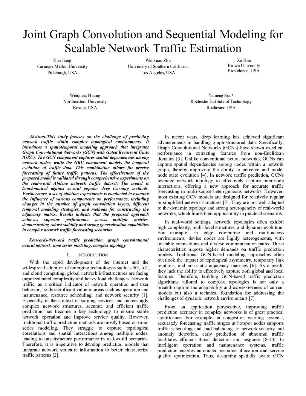 This study focuses on the challenge of predicting network traffic within complex topological environments. It introduces a spatiotemporal modeling approach that integrates Graph Convolutional Networks (GCN) with Gated Recurrent Units (GRU). The GCN component captures spatial dependencies among network nodes, while the GRU component models the temporal evolution of traffic data. This combination allows for precise forecasting of future traffic patterns. The effectiveness of the proposed model is validated through comprehensive experiments on the real-world Abilene network traffic dataset. The model is benchmarked against several popular deep learning methods. Furthermore, a set of ablation experiments is conducted to examine the influence of various components on performance, including changes in the number of graph convolution layers, different temporal modeling strategies, and methods for constructing the adjacency matrix. Results indicate that the proposed approach achieves superior performance across multiple metrics, demonstrating robust stability and strong generalization capabilities in complex network traffic forecasting scenarios.