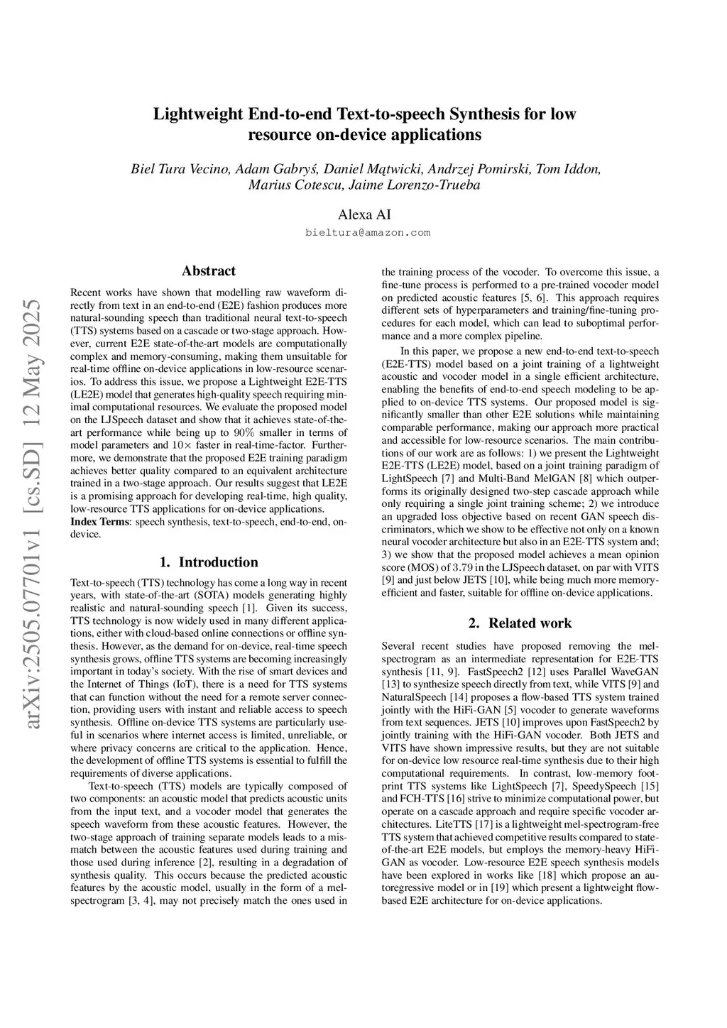 Lightweight End-to-end Text-to-speech Synthesis for low resource on-device applications