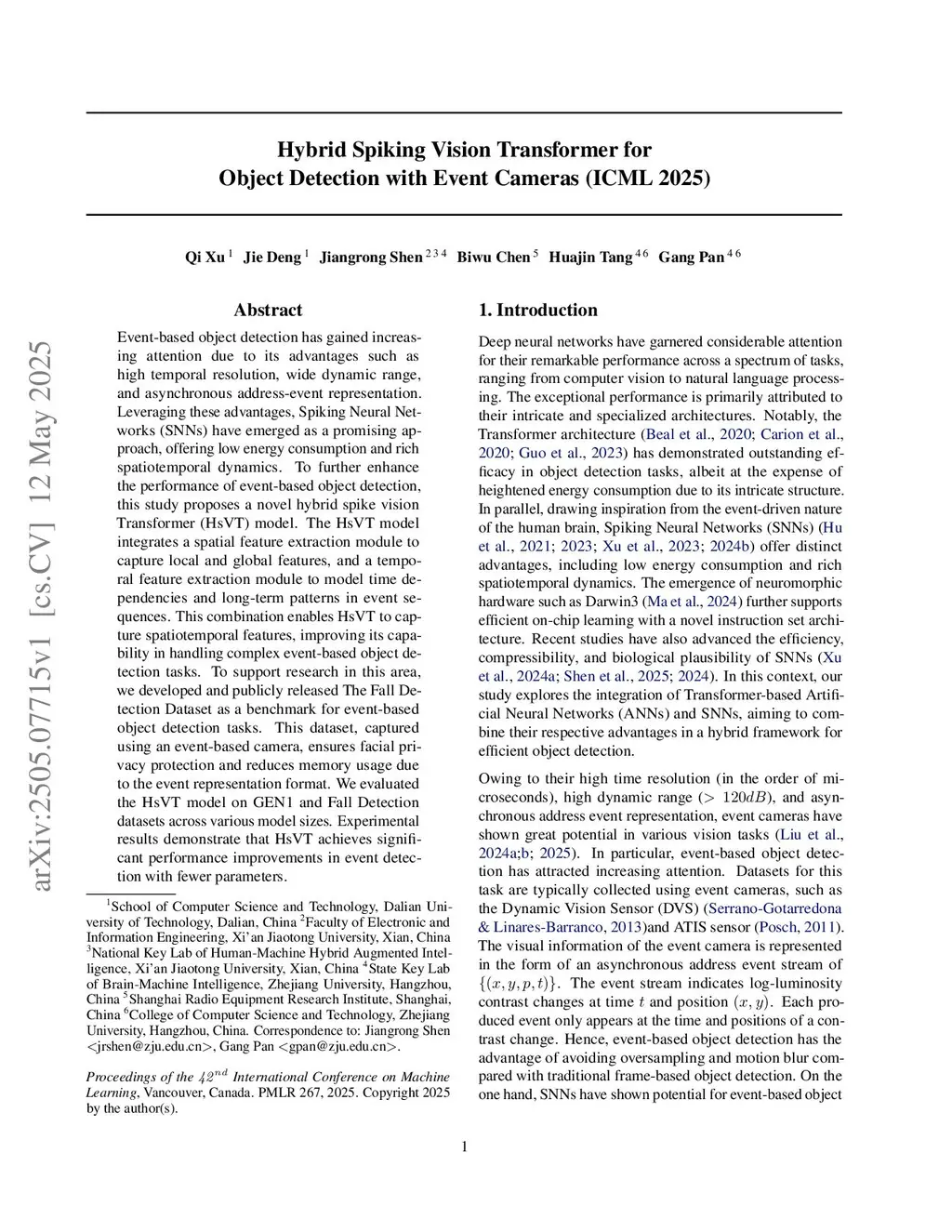 Event-based object detection has gained increasing attention due to its advantages such as high temporal resolution, wide dynamic range, and asynchronous address-event representation. Leveraging these advantages, Spiking Neural Networks (SNNs) have emerged as a promising approach, offering low energy consumption and rich spatiotemporal dynamics. To further enhance the performance of event-based object detection, this study proposes a novel hybrid spike vision Transformer (HsVT) model. The HsVT model integrates a spatial feature extraction module to capture local and global features, and a temporal feature extraction module to model time dependencies and long-term patterns in event sequences. This combination enables HsVT to capture spatiotemporal features, improving its capability to handle complex event-based object detection tasks. To support research in this area, we developed and publicly released The Fall Detection Dataset as a benchmark for event-based object detection tasks. This dataset, captured using an event-based camera, ensures facial privacy protection and reduces memory usage due to the event representation format. We evaluated the HsVT model on GEN1 and Fall Detection datasets across various model sizes. Experimental results demonstrate that HsVT achieves significant performance improvements in event detection with fewer parameters.