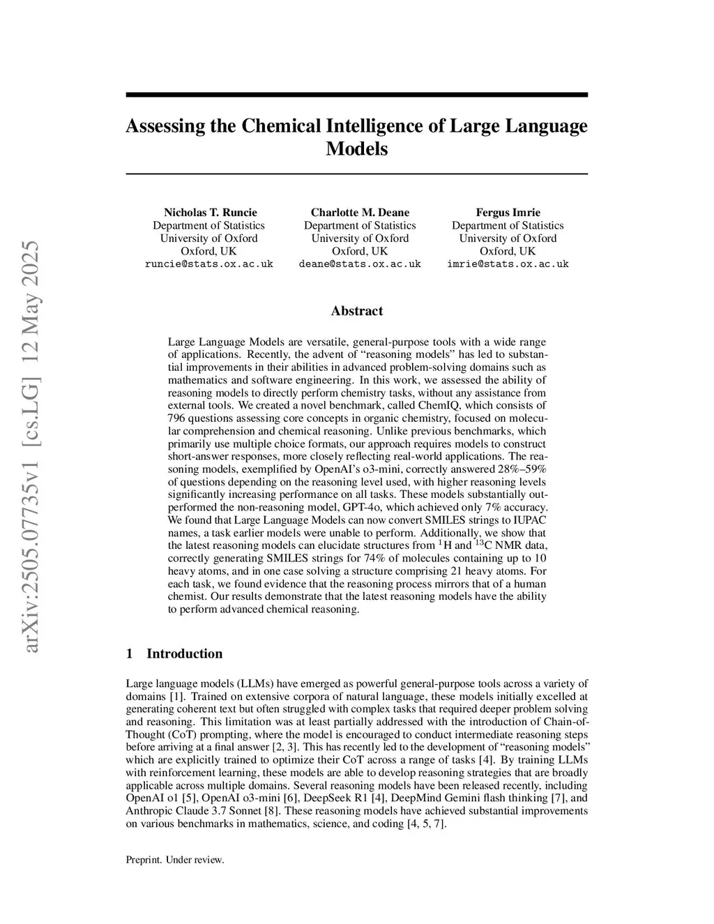 Large Language Models are versatile, general-purpose tools with a wide range of applications. Recently, the advent of "reasoning models" has led to substantial improvements in their abilities in advanced problem-solving domains such as mathematics and software engineering. In this work, we assessed the ability of reasoning models to perform chemistry tasks directly, without any assistance from external tools. We created a novel benchmark, called ChemIQ, consisting of 816 questions assessing core concepts in organic chemistry, focused on molecular comprehension and chemical reasoning. Unlike previous benchmarks, which primarily use multiple choice formats, our approach requires models to construct short-answer responses, more closely reflecting real-world applications. The reasoning models, OpenAI's o3-mini, Google's Gemini Pro 2.5, and DeepSeek R1, answered 50%-57% of questions correctly in the highest reasoning modes, with higher reasoning levels significantly increasing performance on all tasks. These models substantially outperformed the non-reasoning models which achieved only 3%-7% accuracy. We found that Large Language Models can now convert SMILES strings to IUPAC names, a task earlier models were unable to perform. Additionally, we show that the latest reasoning models can elucidate structures from 1D and 2D 1H and 13C NMR data, with Gemini Pro 2.5 correctly generating SMILES strings for around 90% of molecules containing up to 10 heavy atoms, and in one case solving a structure comprising 25 heavy atoms. For each task, we found evidence that the reasoning process mirrors that of a human chemist. Our results demonstrate that the latest reasoning models can, in some cases, perform advanced chemical reasoning.