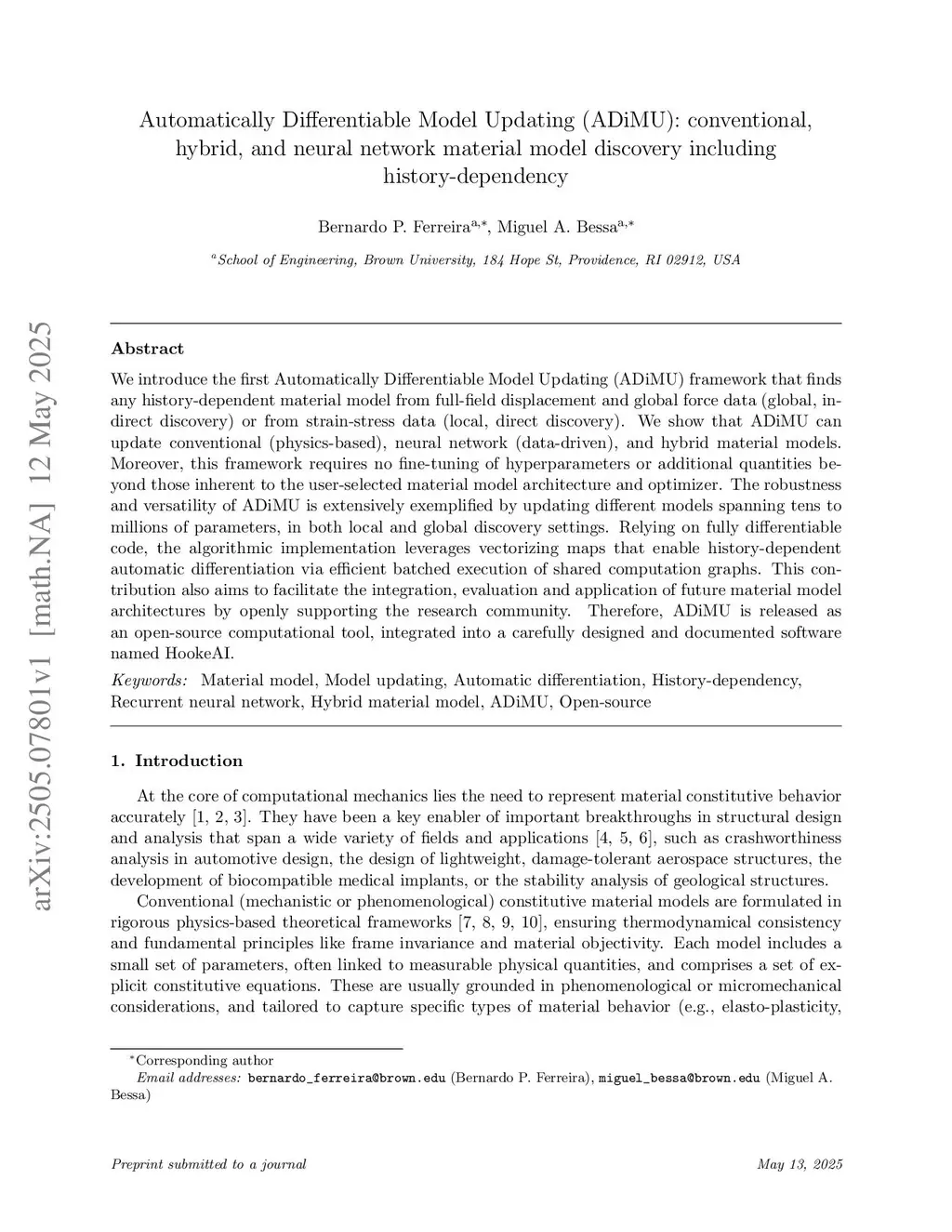 We introduce the first Automatically Differentiable Model Updating (ADiMU) framework that finds any history-dependent material model from full-field displacement and global force data (global, indirect discovery) or from strain-stress data (local, direct discovery). We show that ADiMU can update conventional (physics-based), neural network (data-driven), and hybrid material models. Moreover, this framework requires no fine-tuning of hyperparameters or additional quantities beyond those inherent to the user-selected material model architecture and optimizer. The robustness and versatility of ADiMU is extensively exemplified by updating different models spanning tens to millions of parameters, in both local and global discovery settings. Relying on fully differentiable code, the algorithmic implementation leverages vectorizing maps that enable history-dependent automatic differentiation via efficient batched execution of shared computation graphs. This contribution also aims to facilitate the integration, evaluation and application of future material model architectures by openly supporting the research community. Therefore, ADiMU is released as an open-source computational tool, integrated into a carefully designed and documented software named HookeAI.