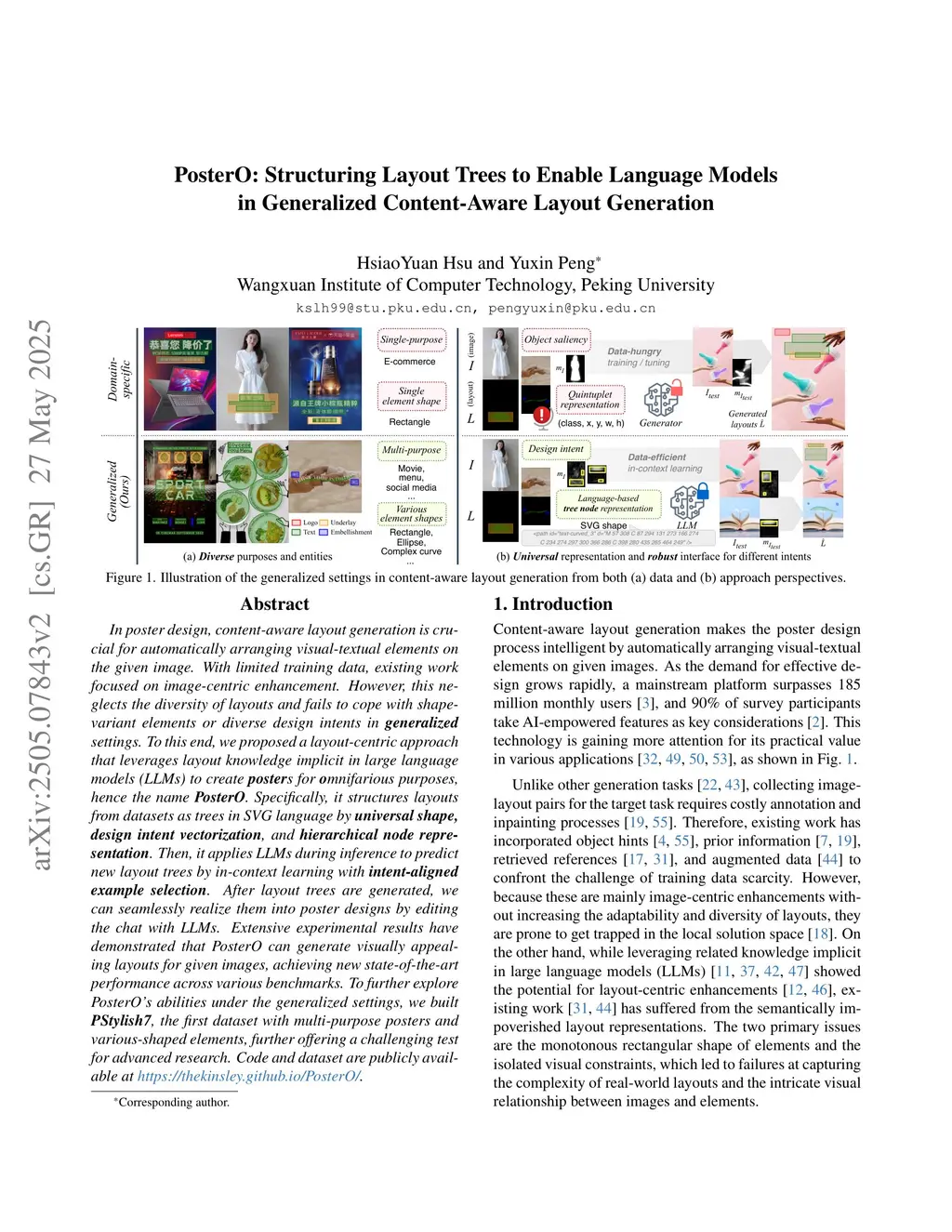 In poster design, content-aware layout generation is crucial for automatically arranging visual-textual elements on the given image. With limited training data, existing work focused on image-centric enhancement. However, this neglects the diversity of layouts and fails to cope with shape-variant elements or diverse design intents in generalized settings. To this end, we proposed a layout-centric approach that leverages layout knowledge implicit in large language models (LLMs) to create posters for omnifarious purposes, hence the name PosterO. Specifically, it structures layouts from datasets as trees in SVG language by universal shape, design intent vectorization, and hierarchical node representation. Then, it applies LLMs during inference to predict new layout trees by in-context learning with intent-aligned example selection. After layout trees are generated, we can seamlessly realize them into poster designs by editing the chat with LLMs. Extensive experimental results have demonstrated that PosterO can generate visually appealing layouts for given images, achieving new state-of-the-art performance across various benchmarks. To further explore PosterO's abilities under the generalized settings, we built PStylish7, the first dataset with multi-purpose posters and various-shaped elements, further offering a challenging test for advanced research.