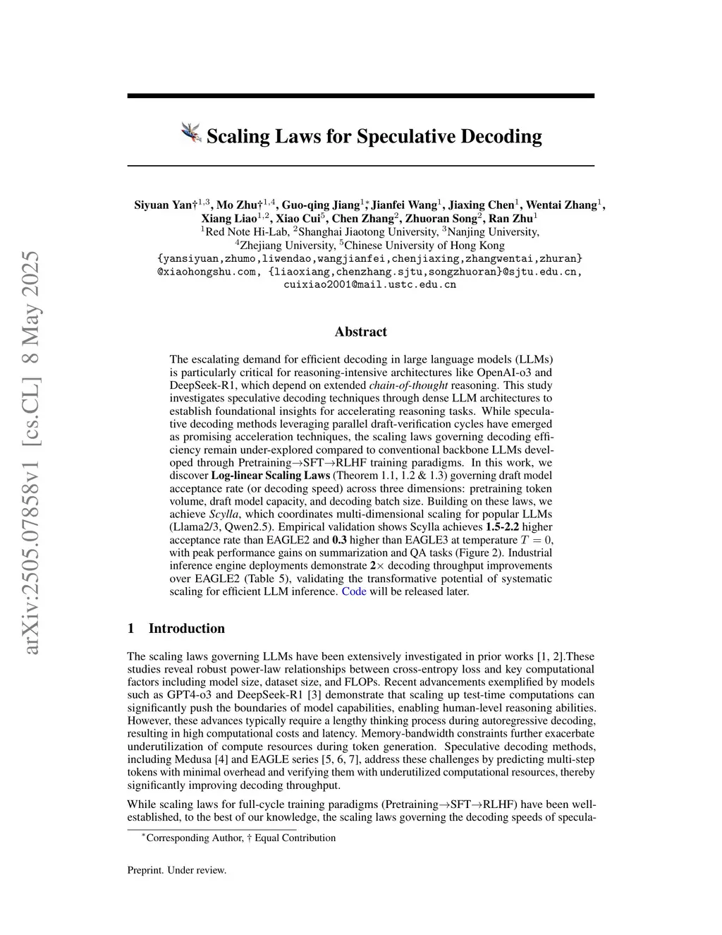 The escalating demand for efficient decoding in large language models (LLMs) is particularly critical for reasoning-intensive architectures like OpenAI-o3 and DeepSeek-R1, which depend on extended chain-of-thought reasoning. This study investigates speculative decoding techniques through dense LLM architectures to establish foundational insights for accelerating reasoning tasks. While speculative decoding methods leveraging parallel draft-verification cycles have emerged as promising acceleration techniques, the scaling laws governing decoding efficiency remain under-explored compared to conventional backbone LLMs developed through Pretraining->SFT->RLHF training paradigms. In this work, we discover Log-linear Scaling Laws (Theorem 1.1, 1.2 and 1.3) governing draft model acceptance rate (or decoding speed) across three dimensions: pretraining token volume, draft model capacity, and decoding batch size. Building on these laws, we achieve Scylla, which coordinates multi-dimensional scaling for popular LLMs (Llama2/3, Qwen2.5). Empirical validation shows Scylla achieves 1.5-2.2 higher acceptance rate than EAGLE2 and 0.3 higher than EAGLE3 at temperature T = 0, with peak performance gains on summarization and QA tasks (Figure 2). Industrial inference engine deployments demonstrate 2X decoding throughput improvements over EAGLE2 (Table 5), validating the transformative potential of systematic scaling for efficient LLM inference. Code will be released later.