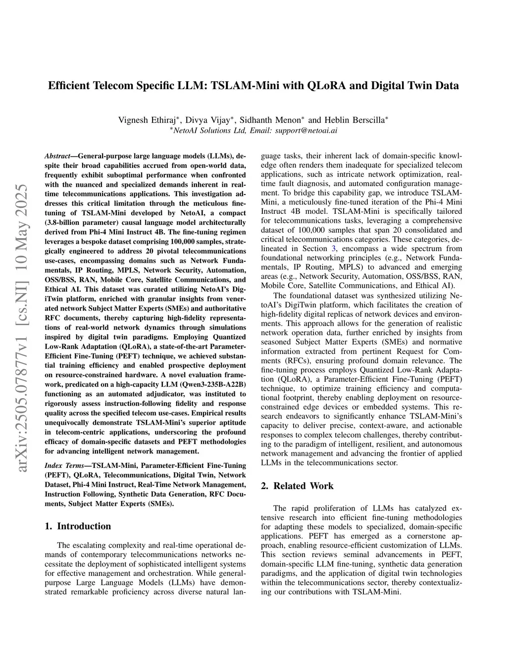 General-purpose large language models (LLMs), despite their broad capabilities accrued from open-world data, frequently exhibit suboptimal performance when confronted with the nuanced and specialized demands inherent in real-time telecommunications applications. This investigation addresses this critical limitation through the meticulous fine-tuning of TSLAM-Mini developed by NetoAI, a compact (3.8-billion parameter) causal language model architecturally derived from Phi-4 Mini Instruct 4B. The fine-tuning regimen leverages a bespoke dataset comprising 100,000 samples, strategically engineered to address 20 pivotal telecommunications use-cases, encompassing domains such as Network Fundamentals, IP Routing, MPLS, Network Security, Automation, OSS/BSS, RAN, Mobile Core, Satellite Communications, and Ethical AI. This dataset was curated utilizing NetoAI's DigiTwin platform, enriched with granular insights from venerated network Subject Matter Experts (SMEs) and authoritative RFC documents, thereby capturing high-fidelity representations of real-world network dynamics through simulations inspired by digital twin paradigms. Employing Quantized Low-Rank Adaptation (QLoRA), a state-of-the-art Parameter Efficient Fine-Tuning (PEFT) technique, we achieved substantial training efficiency and enabled prospective deployment on resource-constrained hardware. A novel evaluation framework, predicated on a high-capacity LLM (Qwen3-235B-A22B) functioning as an automated adjudicator, was instituted to rigorously assess instruction-following fidelity and response quality across the specified telecom use-cases. Empirical results unequivocally demonstrate TSLAM-Mini's superior aptitude in telecom-centric applications, underscoring the profound efficacy of domain-specific datasets and PEFT methodologies for advancing intelligent network management.