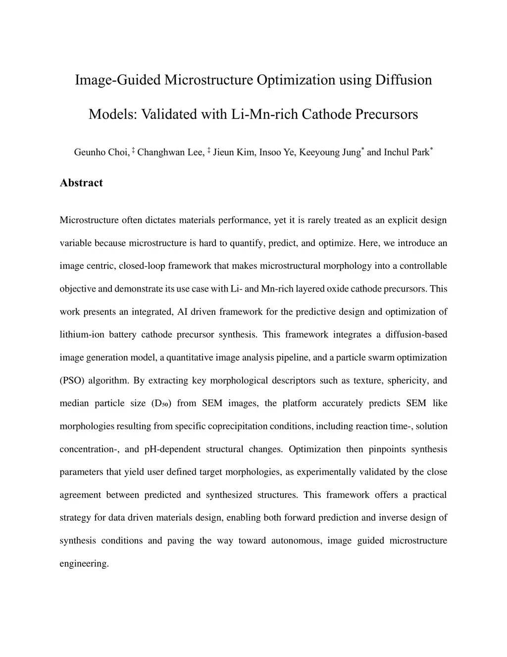 Microstructure often dictates materials performance, yet it is rarely treated as an explicit design variable because microstructure is hard to quantify, predict, and optimize. Here, we introduce an image centric, closed-loop framework that makes microstructural morphology into a controllable objective and demonstrate its use case with Li- and Mn-rich layered oxide cathode precursors. This work presents an integrated, AI driven framework for the predictive design and optimization of lithium-ion battery cathode precursor synthesis. This framework integrates a diffusion-based image generation model, a quantitative image analysis pipeline, and a particle swarm optimization (PSO) algorithm. By extracting key morphological descriptors such as texture, sphericity, and median particle size (D50) from SEM images, the platform accurately predicts SEM like morphologies resulting from specific coprecipitation conditions, including reaction time-, solution concentration-, and pH-dependent structural changes. Optimization then pinpoints synthesis parameters that yield user defined target morphologies, as experimentally validated by the close agreement between predicted and synthesized structures. This framework offers a practical strategy for data driven materials design, enabling both forward prediction and inverse design of synthesis conditions and paving the way toward autonomous, image guided microstructure engineering.