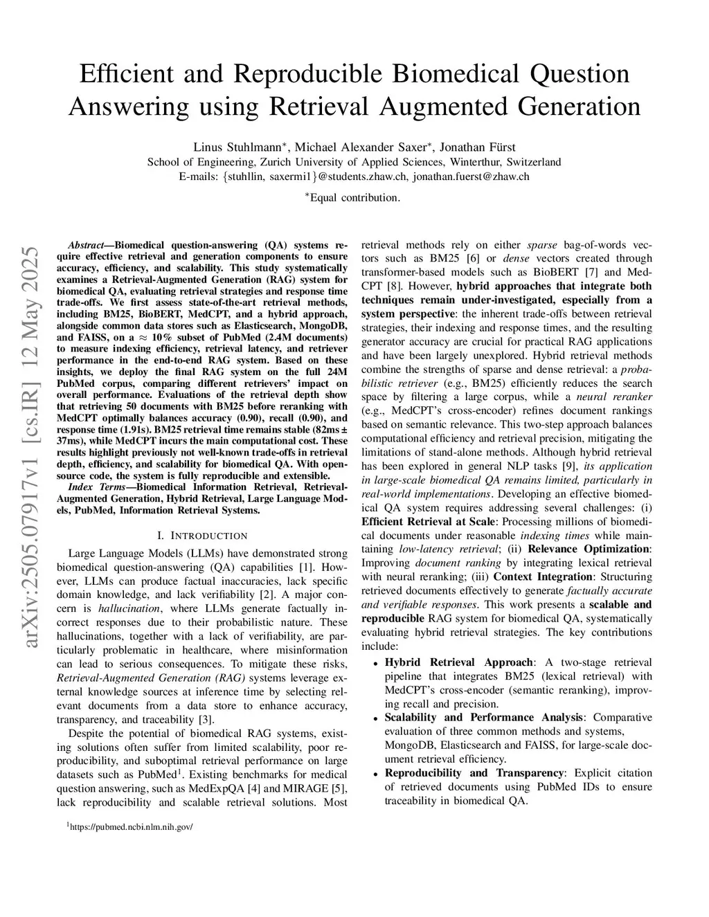 Efficient and Reproducible Biomedical Question Answering using Retrieval Augmented Generation