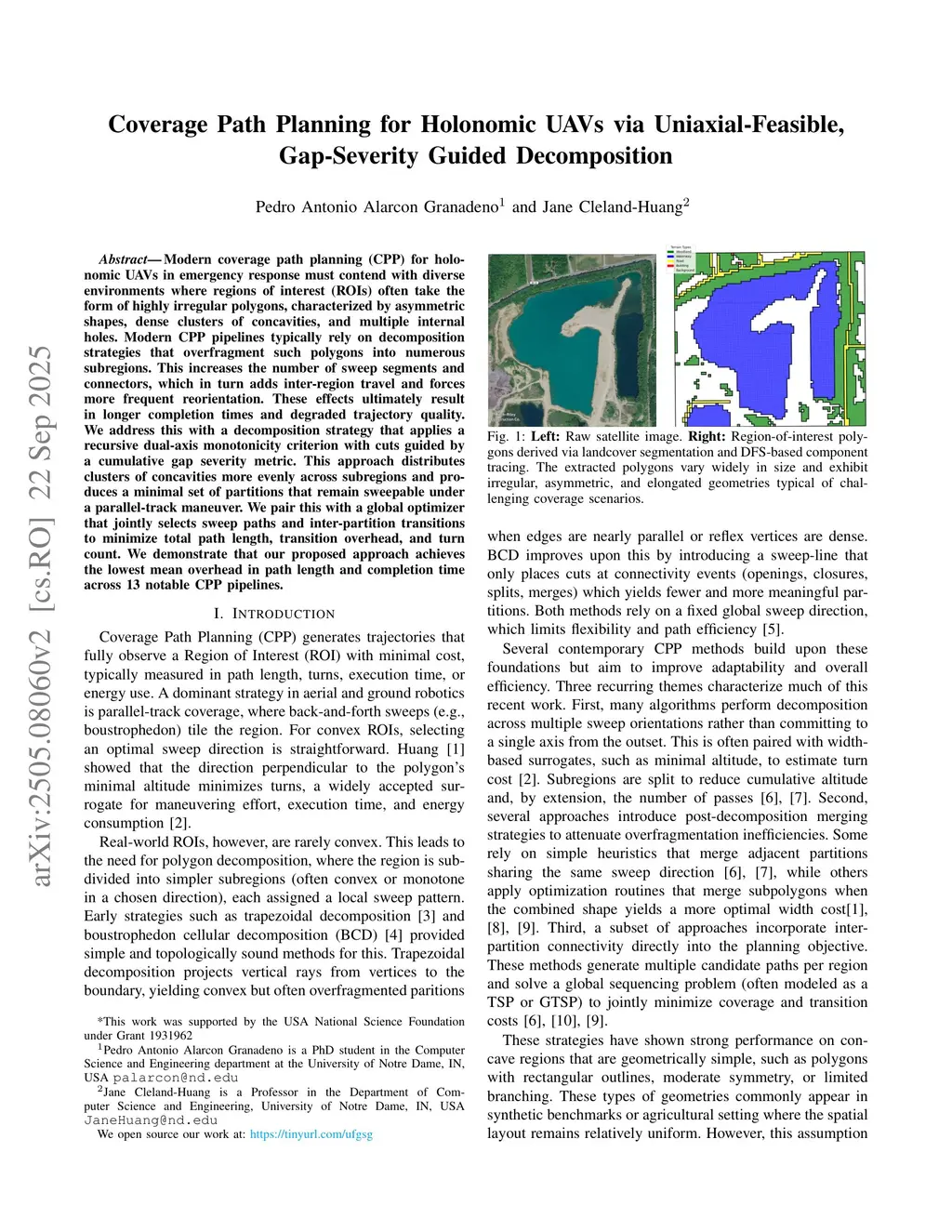 Modern coverage path planning (CPP) for holonomic UAVs in emergency response must contend with diverse environments where regions of interest (ROIs) often take the form of highly irregular polygons, characterized by asymmetric shapes, dense clusters of concavities, and multiple internal holes. Modern CPP pipelines typically rely on decomposition strategies that overfragment such polygons into numerous subregions. This increases the number of sweep segments and connectors, which in turn adds inter-region travel and forces more frequent reorientation. These effects ultimately result in longer completion times and degraded trajectory quality. We address this with a decomposition strategy that applies a recursive dual-axis monotonicity criterion with cuts guided by a cumulative gap severity metric. This approach distributes clusters of concavities more evenly across subregions and produces a minimal set of partitions that remain sweepable under a parallel-track maneuver. We pair this with a global optimizer that jointly selects sweep paths and inter-partition transitions to minimize total path length, transition overhead, and turn count. We demonstrate that our proposed approach achieves the lowest mean overhead in path length and completion time across 13 notable CPP pipelines.