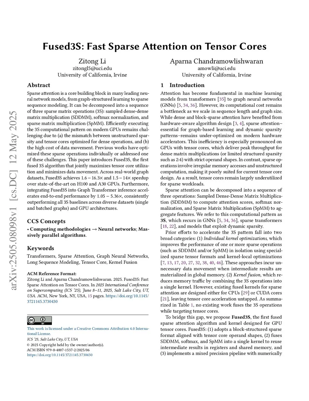 Sparse attention is a core building block in many leading neural network models, from graph-structured learning to sparse sequence modeling. It can be decomposed into a sequence of three sparse matrix operations (3S): sampled dense-dense matrix multiplication (SDDMM), softmax normalization, and sparse matrix multiplication (SpMM). Efficiently executing the 3S computational pattern on modern GPUs remains challenging due to (a) the mismatch between unstructured sparsity and tensor cores optimized for dense operations, and (b) the high cost of data movement. Previous works have optimized these sparse operations individually or addressed one of these challenges. This paper introduces Fused3S, the first fused 3S algorithm that jointly maximizes tensor core utilization and minimizes data movement. Across real-world graph datasets, Fused3S achieves and speedup over state-of-the-art on H100 and A30 GPUs. Furthermore, integrating Fused3S into Graph Transformer inference accelerates end-to-end performance by , consistently outperforming all 3S baselines across diverse datasets (single and batched graphs) and GPU architectures.