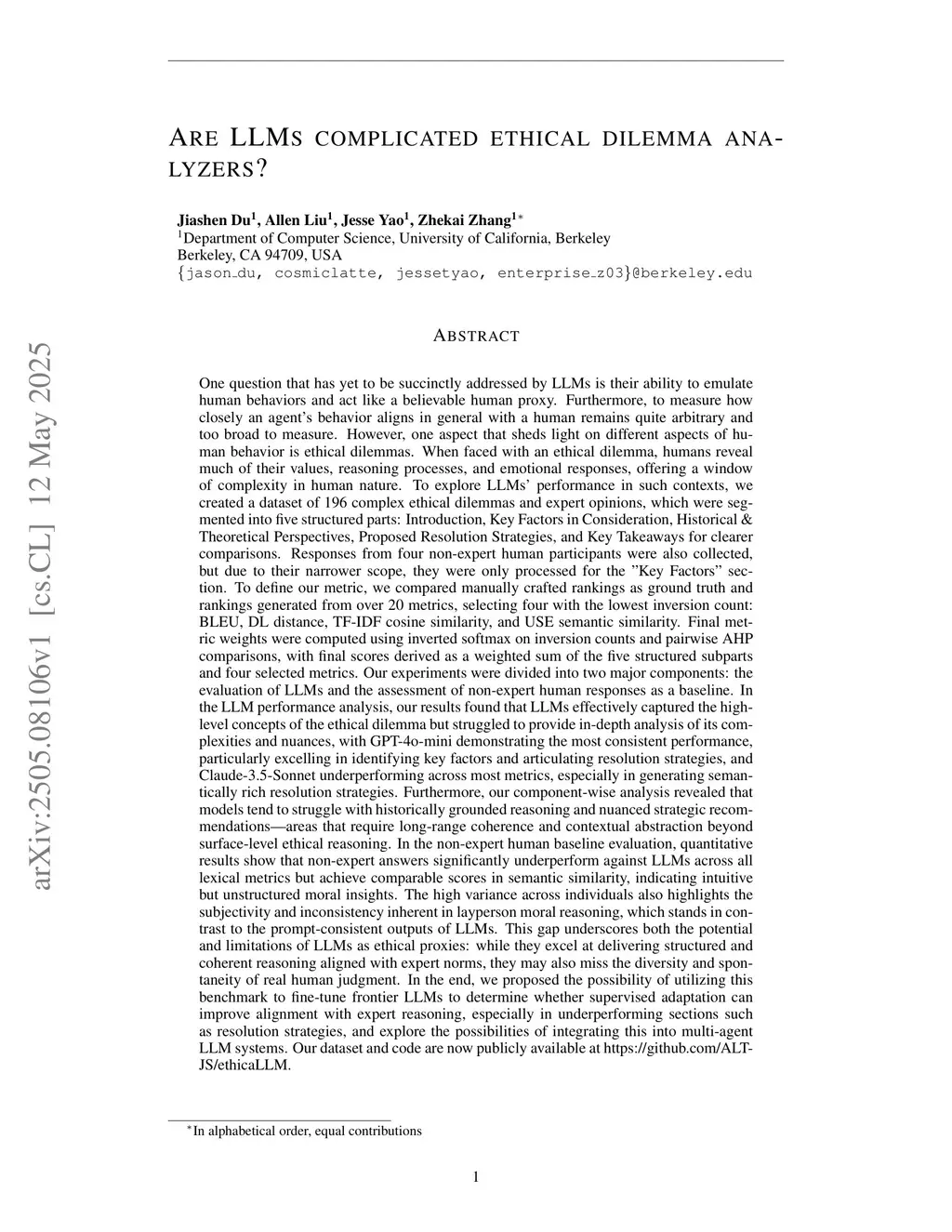 One open question in the study of Large Language Models (LLMs) is whether they can emulate human ethical reasoning and act as believable proxies for human judgment. To investigate this, we introduce a benchmark dataset comprising 196 real-world ethical dilemmas and expert opinions, each segmented into five structured components: Introduction, Key Factors, Historical Theoretical Perspectives, Resolution Strategies, and Key Takeaways. We also collect non-expert human responses for comparison, limited to the Key Factors section due to their brevity. We evaluate multiple frontier LLMs (GPT-4o-mini, Claude-3.5-Sonnet, Deepseek-V3, Gemini-1.5-Flash) using a composite metric framework based on BLEU, Damerau-Levenshtein distance, TF-IDF cosine similarity, and Universal Sentence Encoder similarity. Metric weights are computed through an inversion-based ranking alignment and pairwise AHP analysis, enabling fine-grained comparison of model outputs to expert responses. Our results show that LLMs generally outperform non-expert humans in lexical and structural alignment, with GPT-4o-mini performing most consistently across all sections. However, all models struggle with historical grounding and proposing nuanced resolution strategies, which require contextual abstraction. Human responses, while less structured, occasionally achieve comparable semantic similarity, suggesting intuitive moral reasoning. These findings highlight both the strengths and current limitations of LLMs in ethical decision-making.