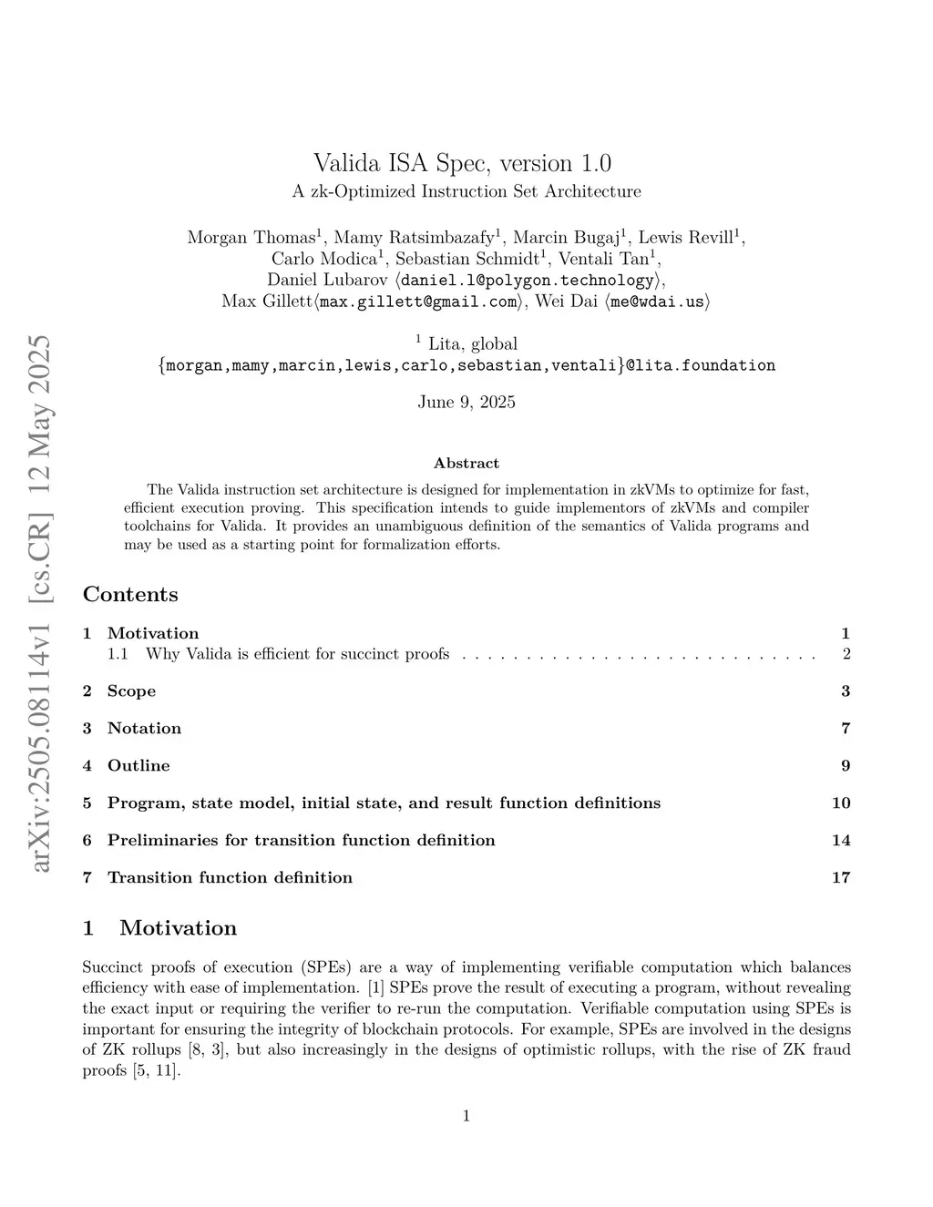 The Valida instruction set architecture is designed for implementation in zkVMs to optimize for fast, efficient execution proving. This specification intends to guide implementors of zkVMs and compiler toolchains for Valida. It provides an unambiguous definition of the semantics of Valida programs and may be used as a starting point for formalization efforts.