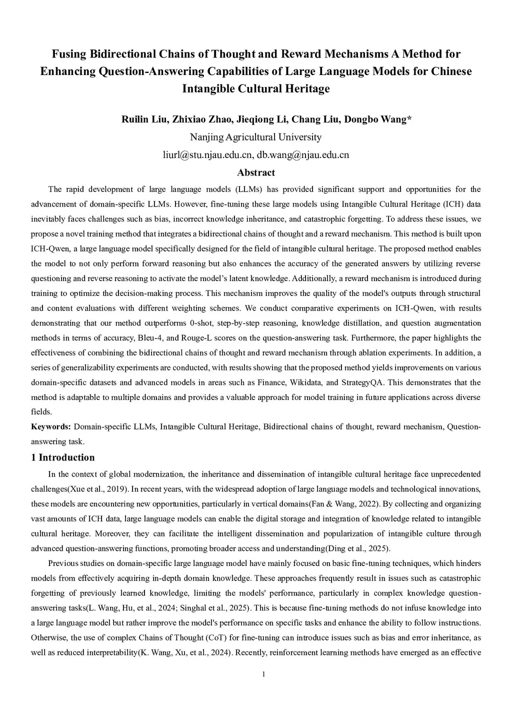 The rapid development of large language models (LLMs) has provided significant support and opportunities for the advancement of domain-specific LLMs. However, fine-tuning these large models using Intangible Cultural Heritage (ICH) data inevitably faces challenges such as bias, incorrect knowledge inheritance, and catastrophic forgetting. To address these issues, we propose a novel training method that integrates a bidirectional chains of thought and a reward mechanism. This method is built upon ICH-Qwen, a large language model specifically designed for the field of intangible cultural heritage. The proposed method enables the model to not only perform forward reasoning but also enhances the accuracy of the generated answers by utilizing reverse questioning and reverse reasoning to activate the model's latent knowledge. Additionally, a reward mechanism is introduced during training to optimize the decision-making process. This mechanism improves the quality of the model's outputs through structural and content evaluations with different weighting schemes. We conduct comparative experiments on ICH-Qwen, with results demonstrating that our method outperforms 0-shot, step-by-step reasoning, knowledge distillation, and question augmentation methods in terms of accuracy, Bleu-4, and Rouge-L scores on the question-answering task. Furthermore, the paper highlights the effectiveness of combining the bidirectional chains of thought and reward mechanism through ablation experiments. In addition, a series of generalizability experiments are conducted, with results showing that the proposed method yields improvements on various domain-specific datasets and advanced models in areas such as Finance, Wikidata, and StrategyQA. This demonstrates that the method is adaptable to multiple domains and provides a valuable approach for model training in future applications across diverse fields.