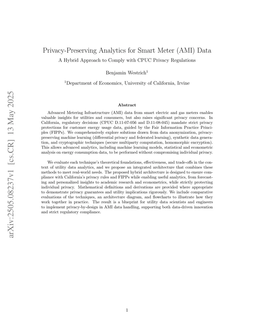 Advanced Metering Infrastructure (AMI) data from smart electric and gas meters enables valuable insights for utilities and consumers, but also raises significant privacy concerns. In California, regulatory decisions (CPUC D.11-07-056 and D.11-08-045) mandate strict privacy protections for customer energy usage data, guided by the Fair Information Practice Principles (FIPPs). We comprehensively explore solutions drawn from data anonymization, privacy-preserving machine learning (differential privacy and federated learning), synthetic data generation, and cryptographic techniques (secure multiparty computation, homomorphic encryption). This allows advanced analytics, including machine learning models, statistical and econometric analysis on energy consumption data, to be performed without compromising individual privacy.We evaluate each technique's theoretical foundations, effectiveness, and trade-offs in the context of utility data analytics, and we propose an integrated architecture that combines these methods to meet real-world needs. The proposed hybrid architecture is designed to ensure compliance with California's privacy rules and FIPPs while enabling useful analytics, from forecasting and personalized insights to academic research and econometrics, while strictly protecting individual privacy. Mathematical definitions and derivations are provided where appropriate to demonstrate privacy guarantees and utility implications rigorously. We include comparative evaluations of the techniques, an architecture diagram, and flowcharts to illustrate how they work together in practice. The result is a blueprint for utility data scientists and engineers to implement privacy-by-design in AMI data handling, supporting both data-driven innovation and strict regulatory compliance.