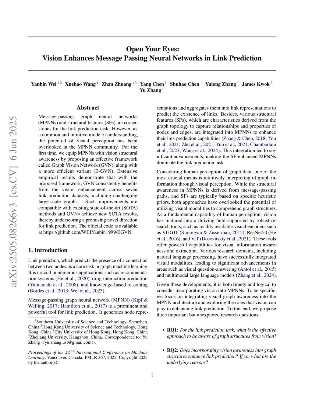 Message-passing graph neural networks (MPNNs) and structural features (SFs) are cornerstones for the link prediction task. However, as a common and intuitive mode of understanding, the potential of visual perception has been overlooked in the MPNN community. For the first time, we equip MPNNs with vision structural awareness by proposing an effective framework called Graph Vision Network (GVN), along with a more efficient variant (E-GVN). Extensive empirical results demonstrate that with the proposed frameworks, GVN consistently benefits from the vision enhancement across seven link prediction datasets, including challenging large-scale graphs. Such improvements are compatible with existing state-of-the-art (SOTA) methods and GVNs achieve new SOTA results, thereby underscoring a promising novel direction for link prediction.