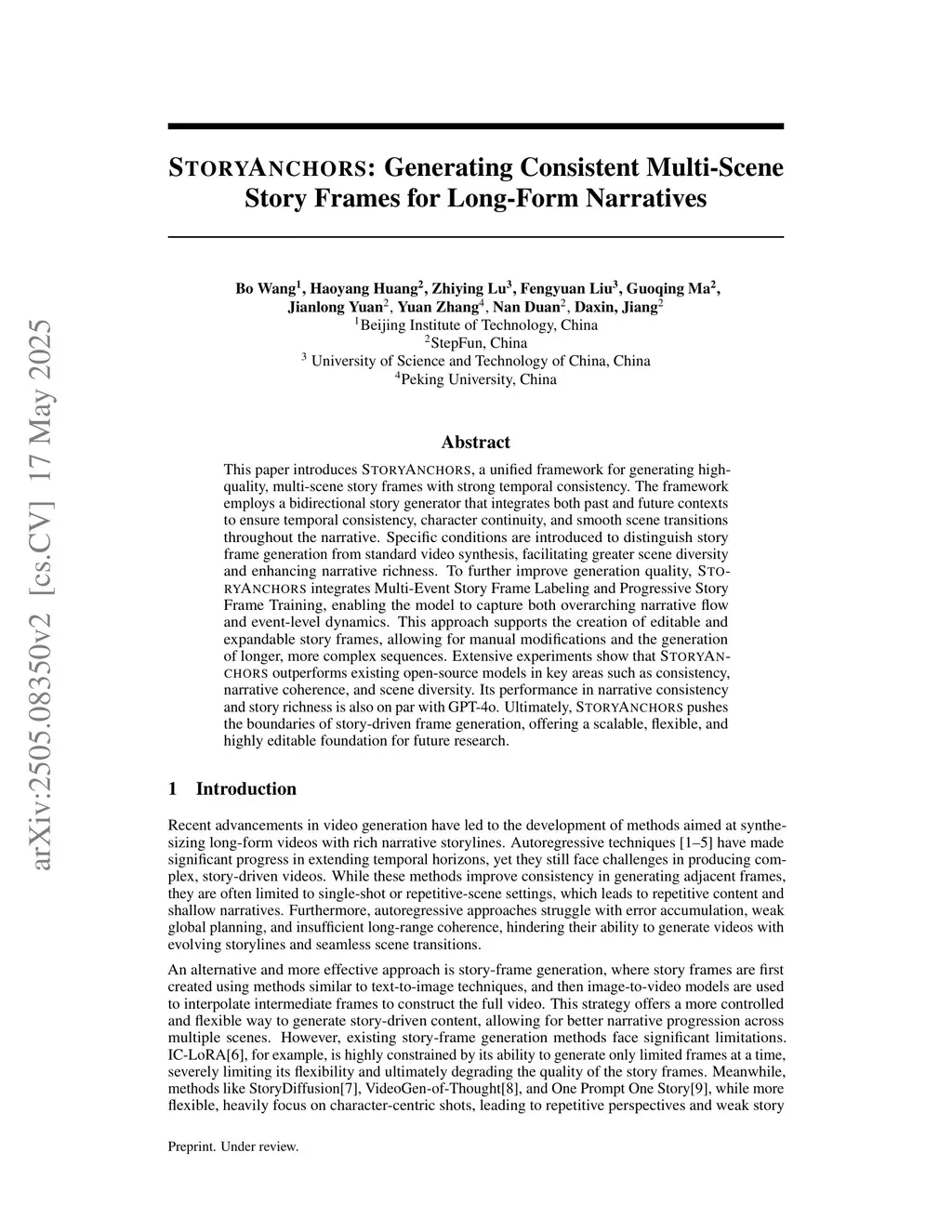 This paper introduces StoryAnchors, a unified framework for generating high-quality, multi-scene story frames with strong temporal consistency. The framework employs a bidirectional story generator that integrates both past and future contexts to ensure temporal consistency, character continuity, and smooth scene transitions throughout the narrative. Specific conditions are introduced to distinguish story frame generation from standard video synthesis, facilitating greater scene diversity and enhancing narrative richness. To further improve generation quality, StoryAnchors integrates Multi-Event Story Frame Labeling and Progressive Story Frame Training, enabling the model to capture both overarching narrative flow and event-level dynamics. This approach supports the creation of editable and expandable story frames, allowing for manual modifications and the generation of longer, more complex sequences. Extensive experiments show that StoryAnchors outperforms existing open-source models in key areas such as consistency, narrative coherence, and scene diversity. Its performance in narrative consistency and story richness is also on par with GPT-4o. Ultimately, StoryAnchors pushes the boundaries of story-driven frame generation, offering a scalable, flexible, and highly editable foundation for future research.