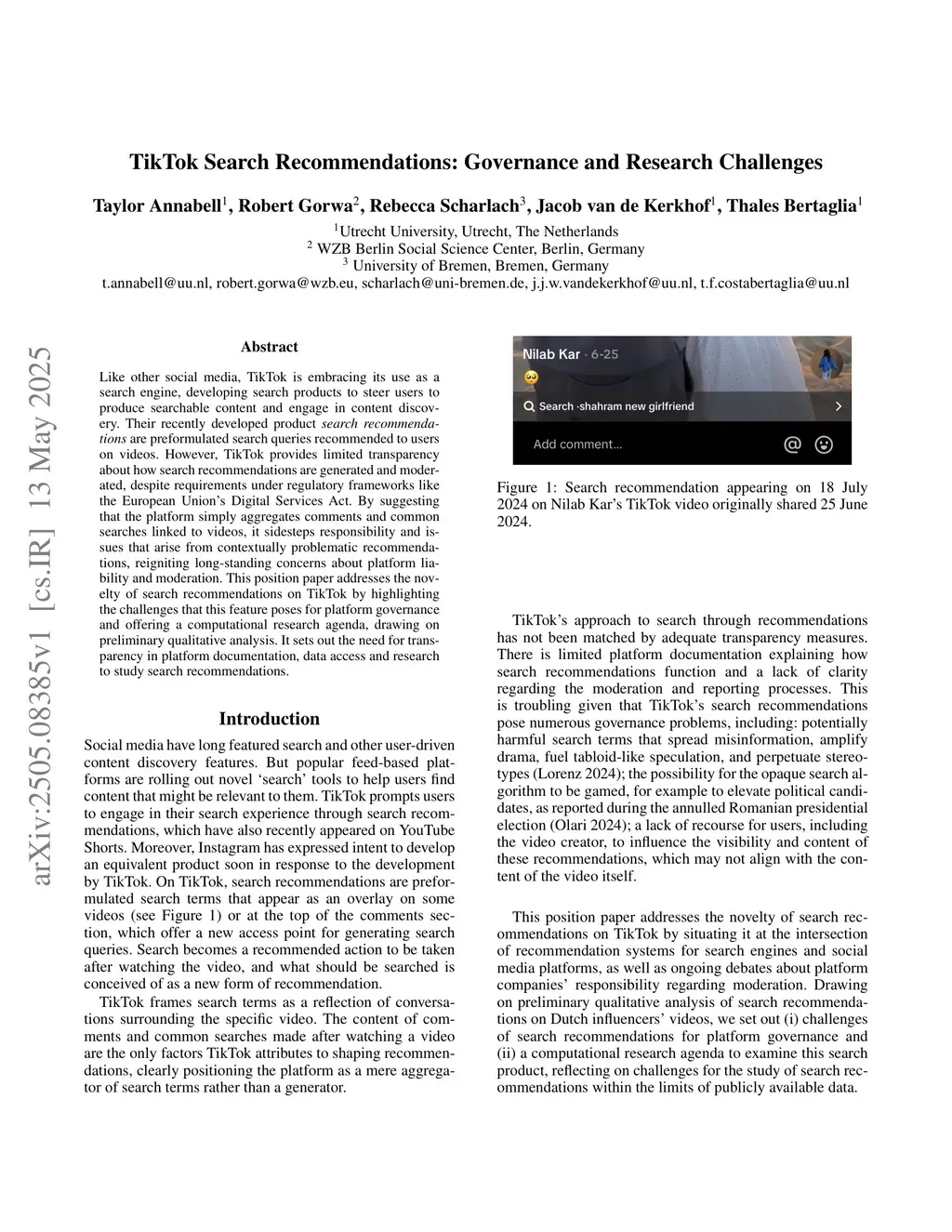 Like other social media, TikTok is embracing its use as a search engine, developing search products to steer users to produce searchable content and engage in content discovery. Their recently developed product search recommendations are preformulated search queries recommended to users on videos. However, TikTok provides limited transparency about how search recommendations are generated and moderated, despite requirements under regulatory frameworks like the European Union's Digital Services Act. By suggesting that the platform simply aggregates comments and common searches linked to videos, it sidesteps responsibility and issues that arise from contextually problematic recommendations, reigniting long-standing concerns about platform liability and moderation. This position paper addresses the novelty of search recommendations on TikTok by highlighting the challenges that this feature poses for platform governance and offering a computational research agenda, drawing on preliminary qualitative analysis. It sets out the need for transparency in platform documentation, data access and research to study search recommendations.